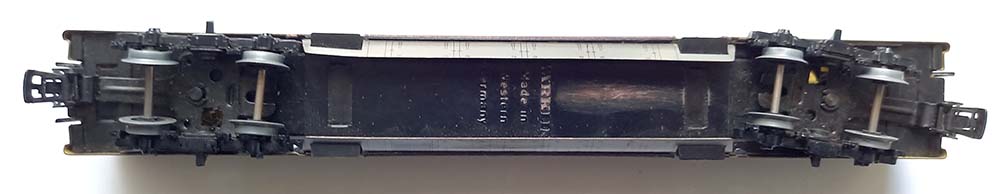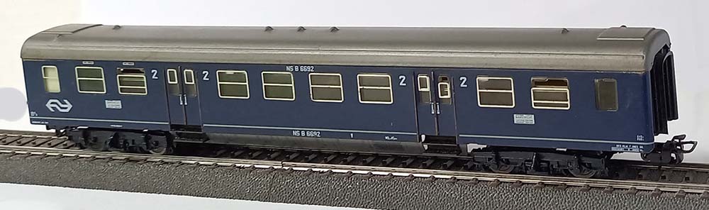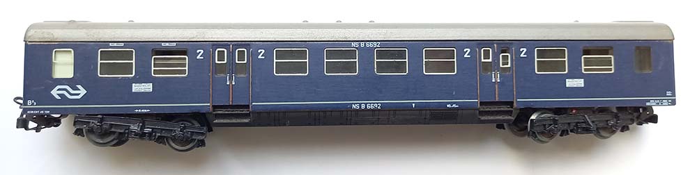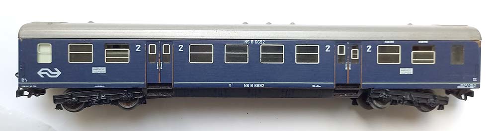 D-Trein rijtuig met NS-vignet, 4 assen, type B6600 van de Nederlandse Spoorwegen. Lengte over de buffers 24cm. Geen verlichting. Kleine afwrijving op 1 bovenhoek. (zie foto 2 rechtsboven). Verder uitstekende staat.