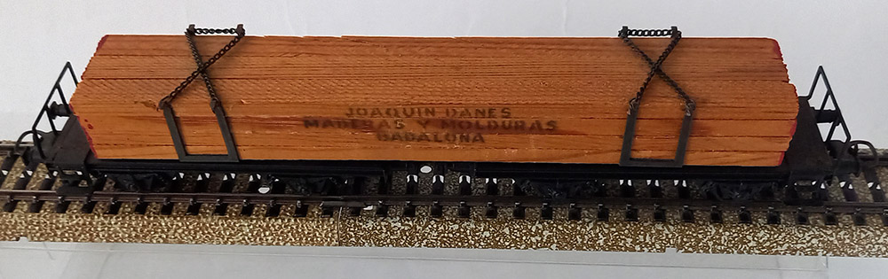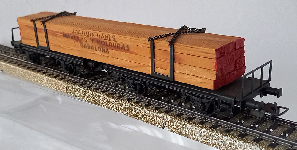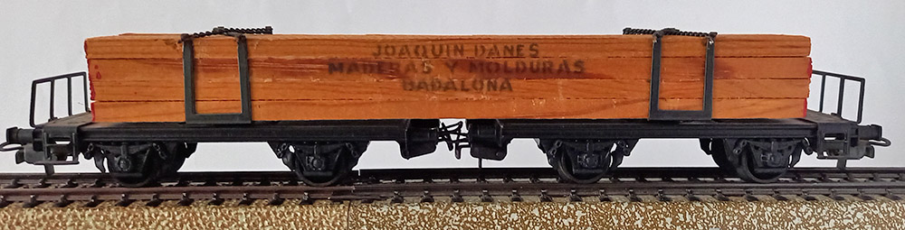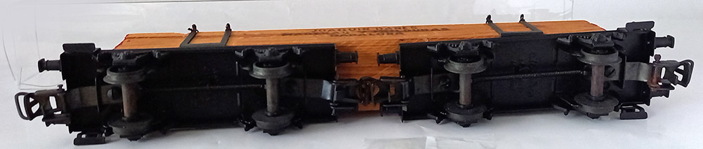 uit 1963. Twsee schemelwagens beladen met houten planken. Omdat de wielen geïsoleerd zijn kan deze mooie wagen zowel op de Märklinbaan alswel op de gelijkstroombaan rijden. Uitstekende staat.
