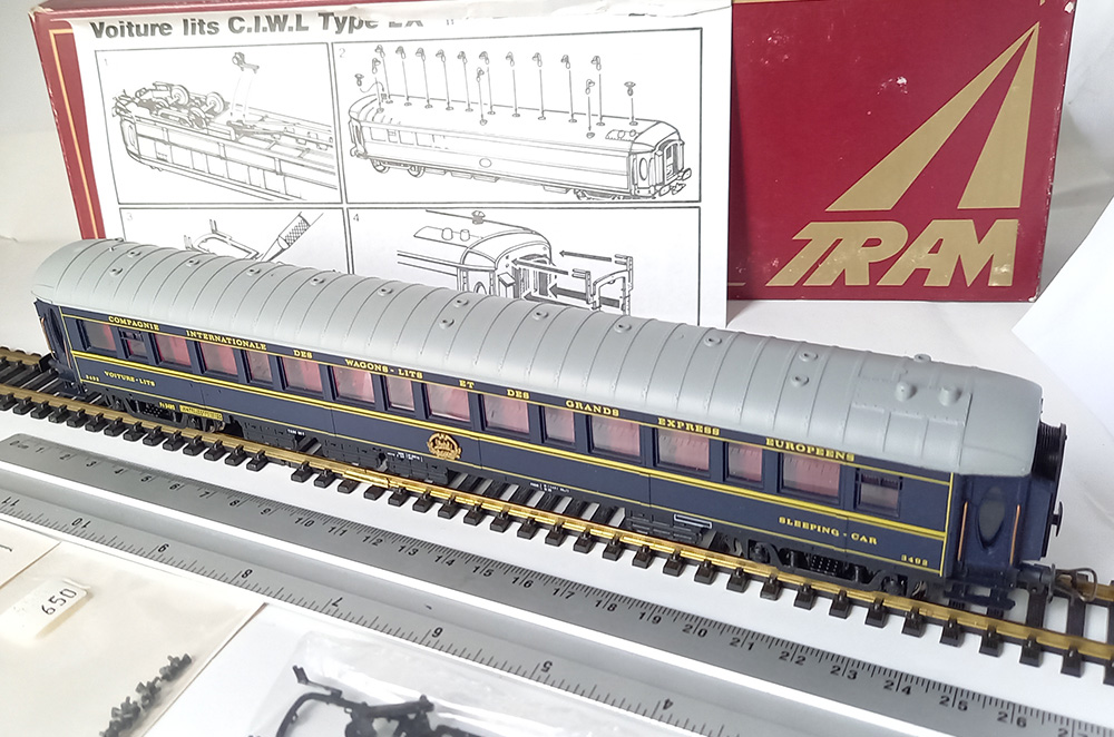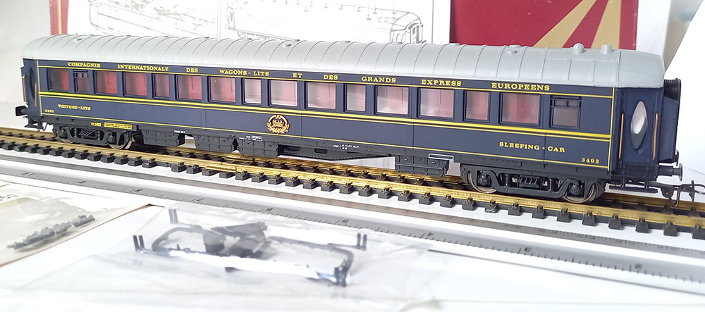 CIWL type LX slaapwagon, wagennummer 3492 - SNCF - met interieur, aanbouwdelen en toelichting nieuw in originele (ietwat beschadigde) originele verpakking. Na plaatsen van de luchters blijven er 4 gaatjes over......