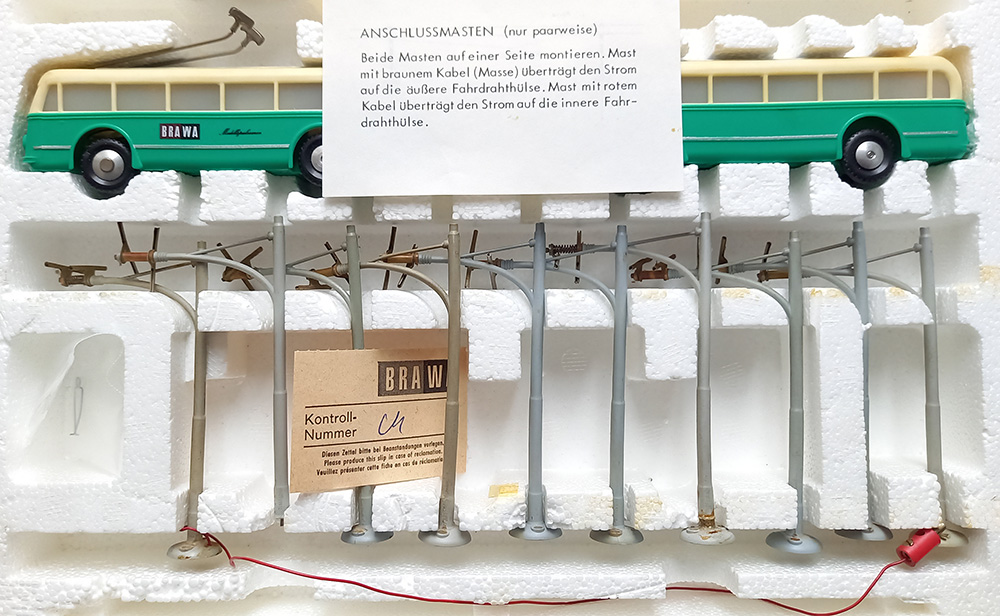 Er zijn 10 bovenleidingpaaltjes, gebruikt, waarvan 1 zonder voet en 1 fungeert als aansluitmast. Er is rijdraad, maar dat is veel te weinig. Daarbij de nodige docu-mentatie en niet te vergeten de originele verpakking met een geweldige 50-er jaren afbeelding.