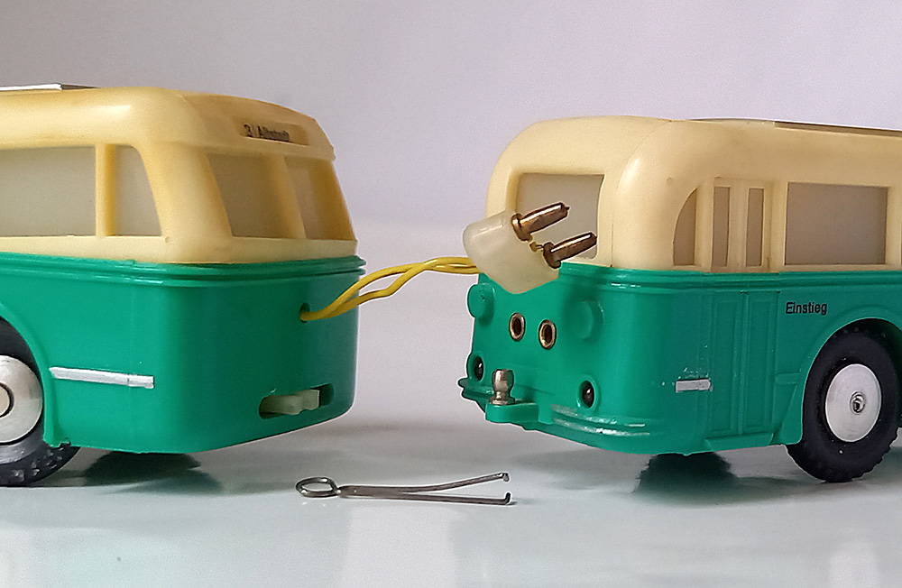 Werkend. De wielen draaien, motorwagen heeft binnenverlichting, de bijwa-gen heeft geen binnenver-lichting maar wel werkende achterlichten. De verbinding tussen de beide stellen is onduidelijk. De pantograaf-houders zijn er niet.