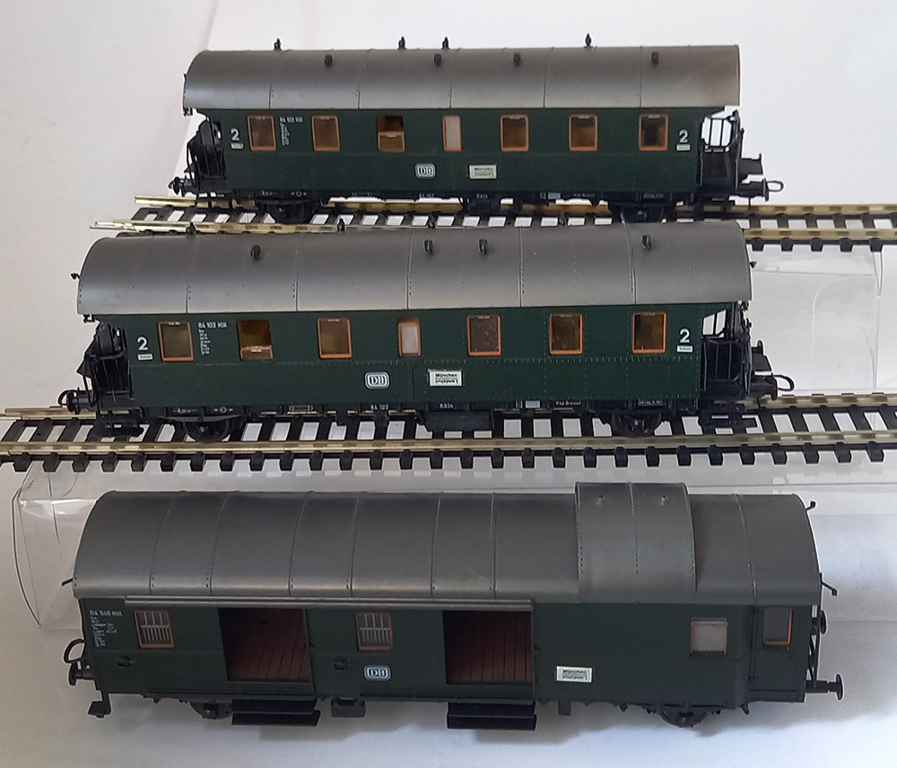 2 prachtige zogenaamde Donnerbuchse en 1 baggagewagen. De laatste heeft 1 imitatiekoppeling en mist deuren. Verder uitstekende staat.