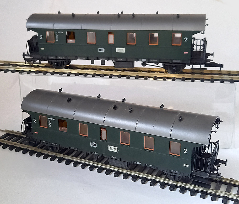 2 personenwagons, zogenaamde Donnerbuchse voorzien van Roco kortkoppelingen. 1 x veert niet en 1 van de wagons is voorzien van een imitatiekoppeling. De wagons zijn verder in uitstekende staat.