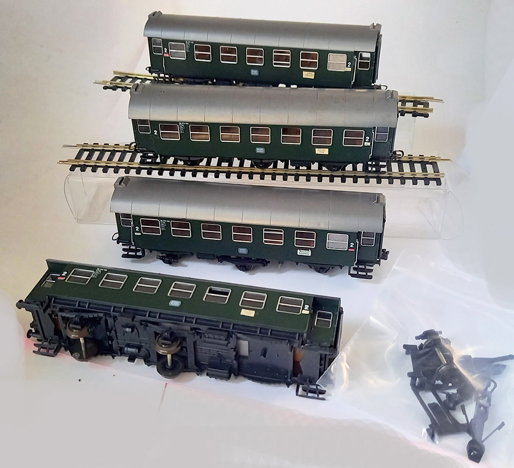 1 Wagon heeft een kortkoppeling die vastgelijmd is en van een andere wagon is het wielstel los, onderdelen worden bijgeleverd. Onhandige klus om dit er weer goed in te krijgen.