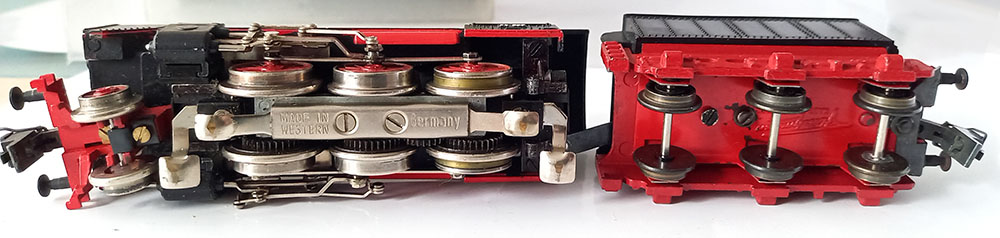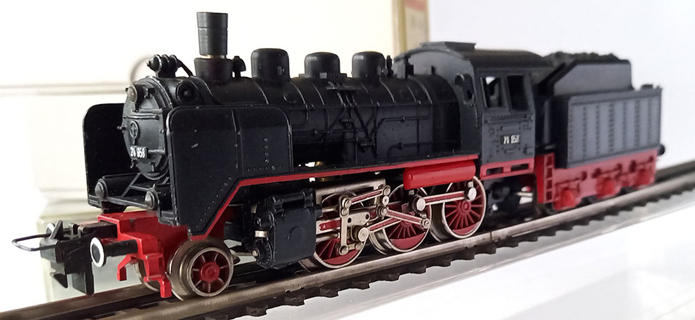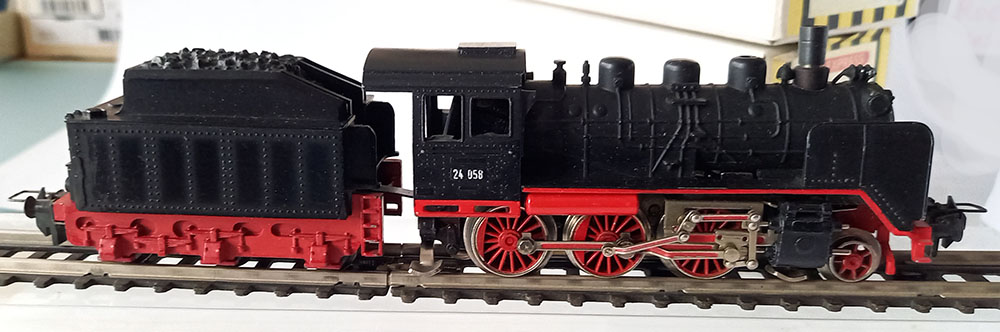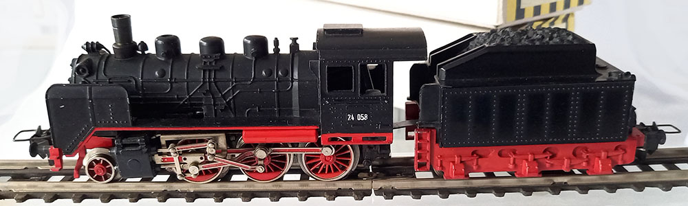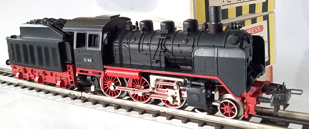 Ho-spoor, 3-rail. Geheel metalen stoomlocomotief BR24 van de Duitse Spoorwegen met 3-assige kunststof tender. 3 Aangedreven assen, Als extra heeft deze loc een werkende rookgenerator (getest). Uitstekende staat, maar frontverlichting is zwak. Vervangende verpakking.