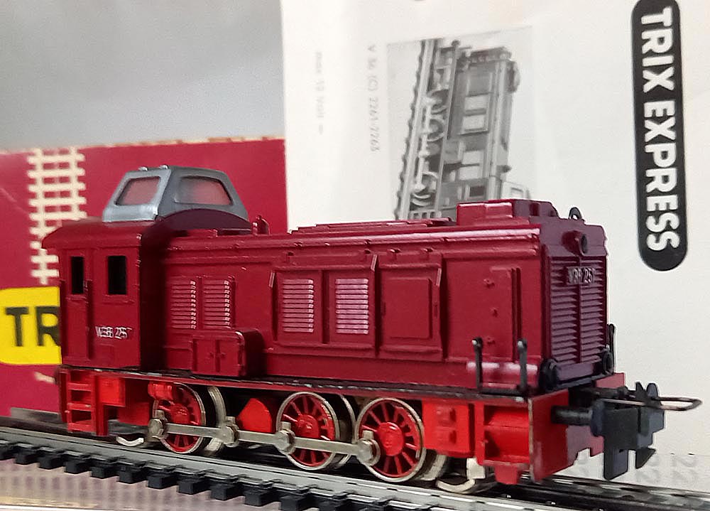 3-assige rangeer diesellok V36, rood, Geheel metaal, 3 werkende koplampen aan beide zijden. Lengte ca 11 cm. Uitstekende staat in originele verpakking met gebruiksaanwijzing.