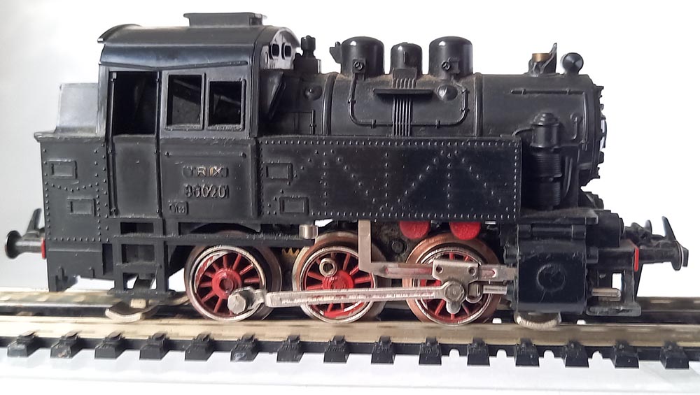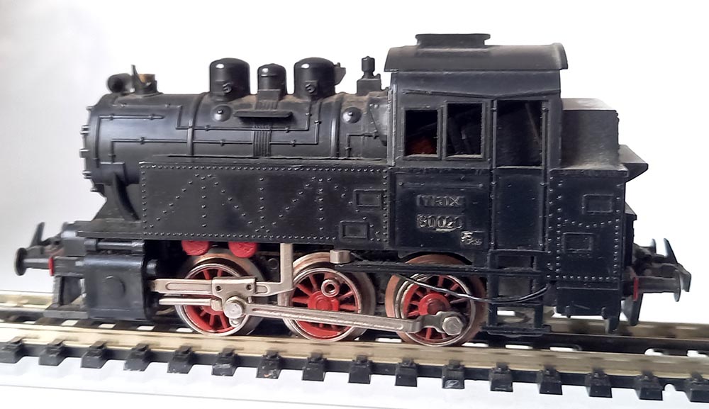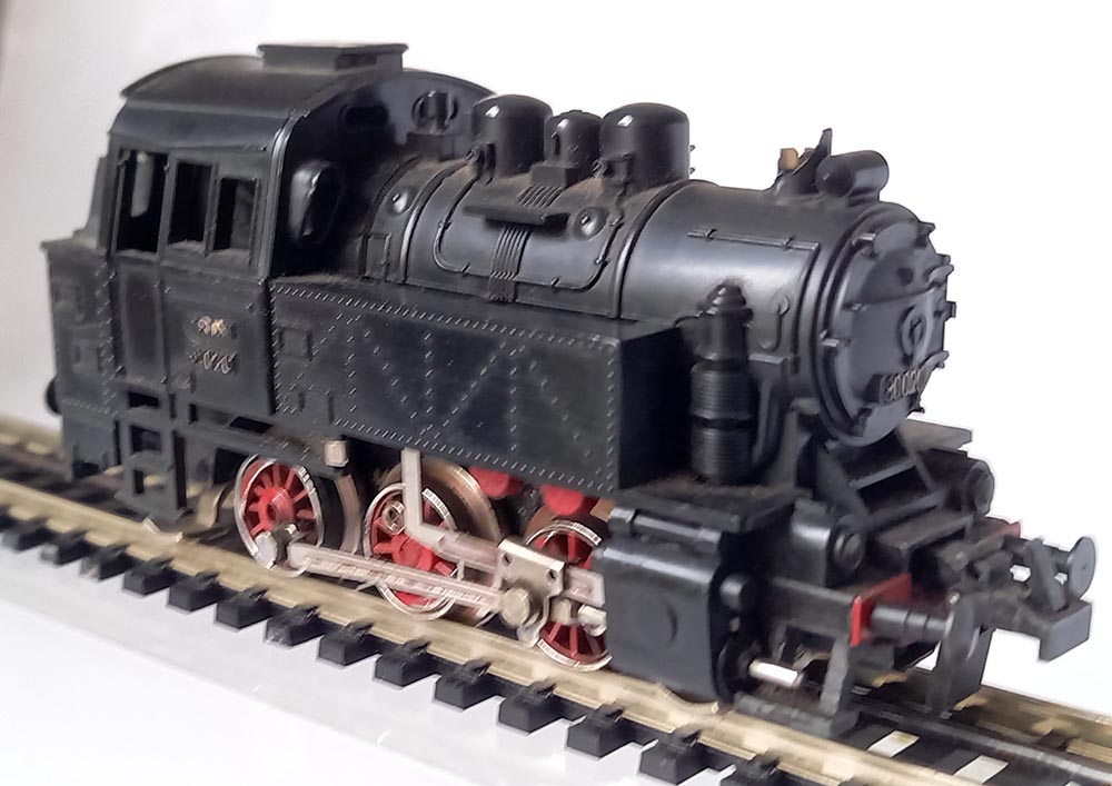 2210 Rangeer tenderloc BR80 voor 3-rail gelijkstroom, 3-assen aangedreven, 3 koplampen voor, kunststofuitvoering, lengte 11 cm. Gewicht ca. 160 gram. Goede staat maar schoorsteen ontbreekt.