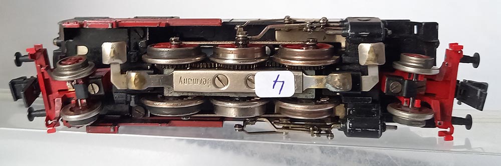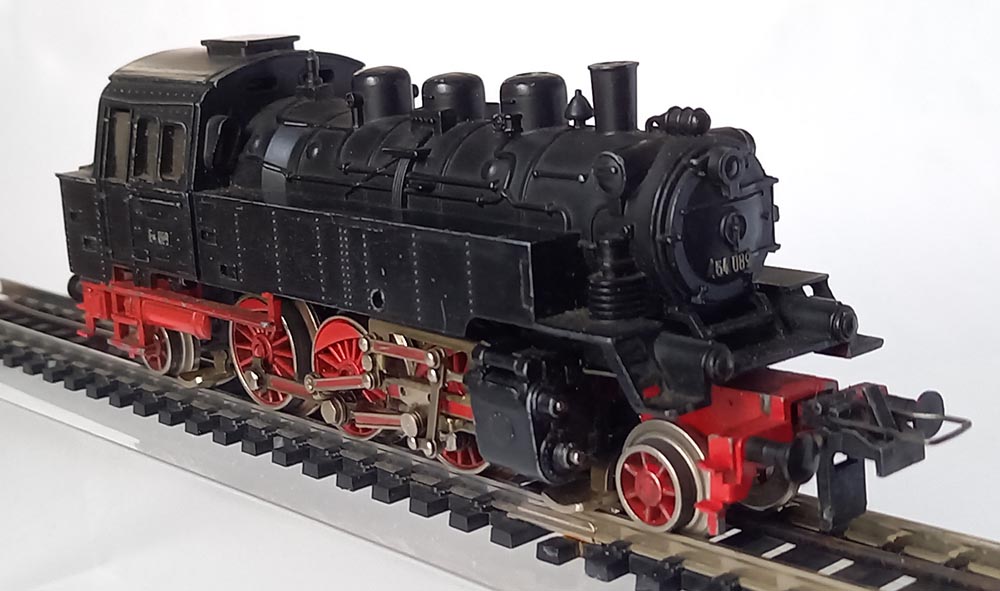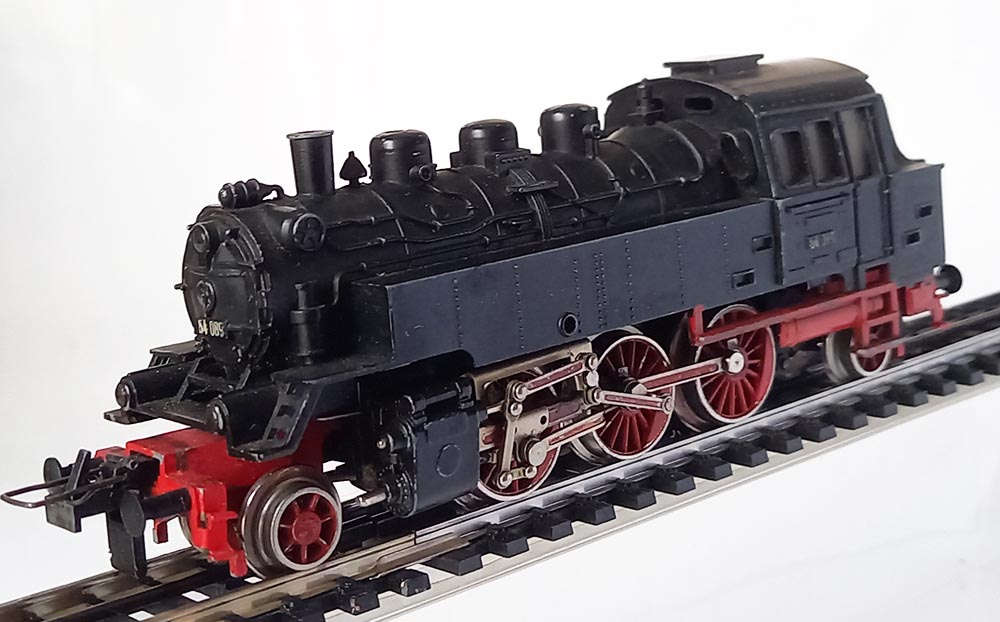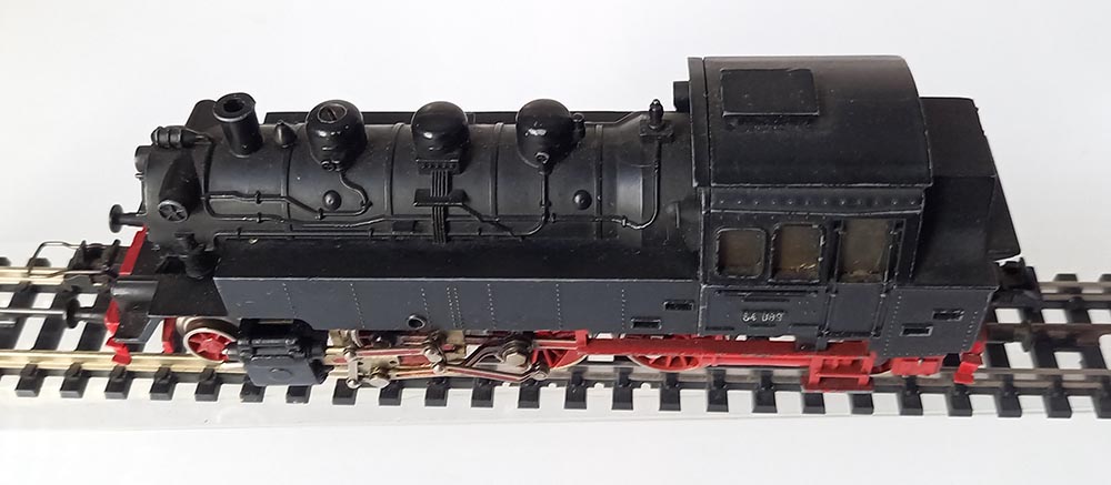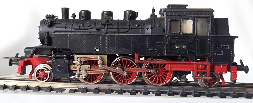 Tenderloc BR64 van de Duitse Spoorwegen, asindeling 1'C'1 lengte 14,5 cm. 3 aangedreven assen met antislipbanden bij 1 as. Verlichting; 3 kopampen voor, lampen achter vranden niet, kleur matzwart. Redelijke staat, goed rijdend.