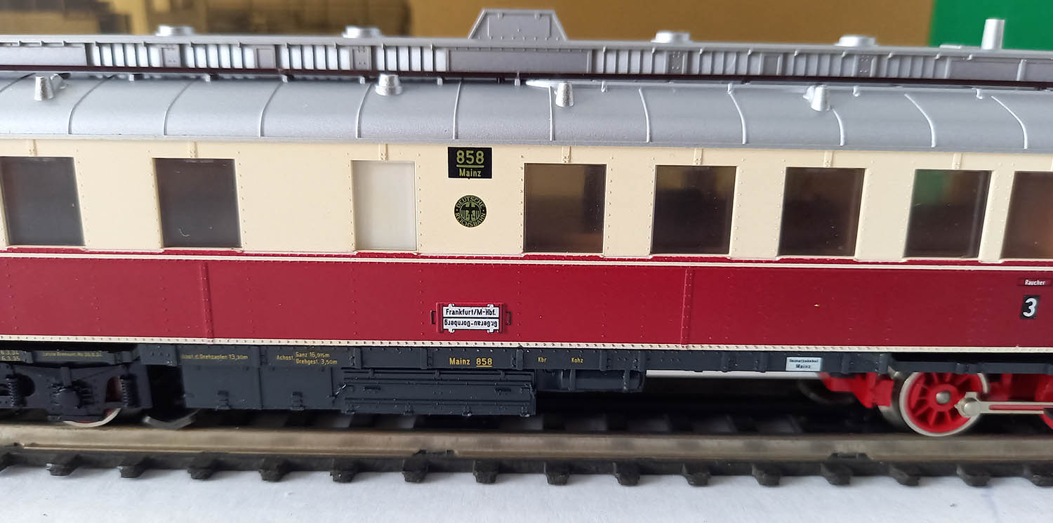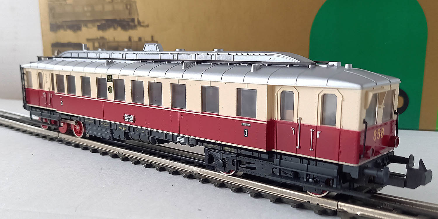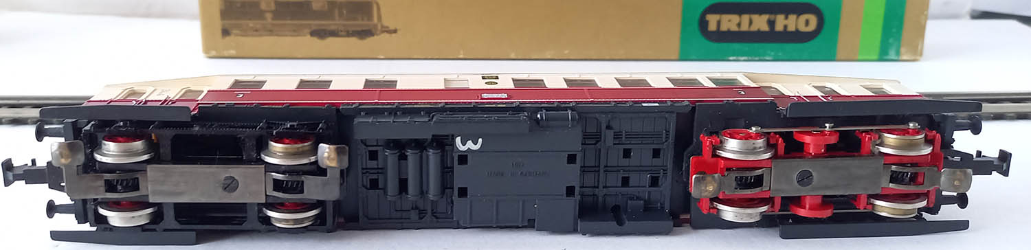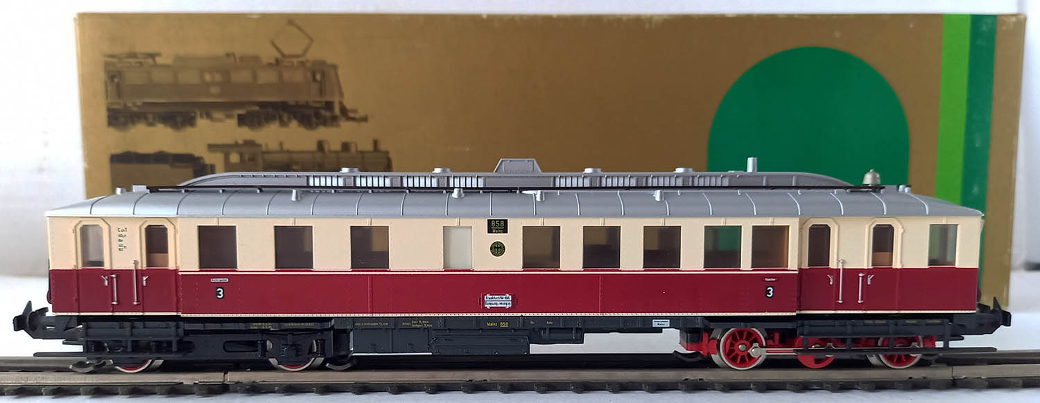 van de Deutsche Reichsbahn bedoeld voor de lokaalbaan in de 30-er jaren, epoche II, 3-rail gelijkstroom, analoog, rood/creme, frontverlichting wisselend met de rijrichting en binnenverlichting. Getest. Uitstekende staat in originele verpakking met gebruiksaanwijzing.