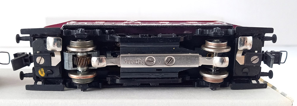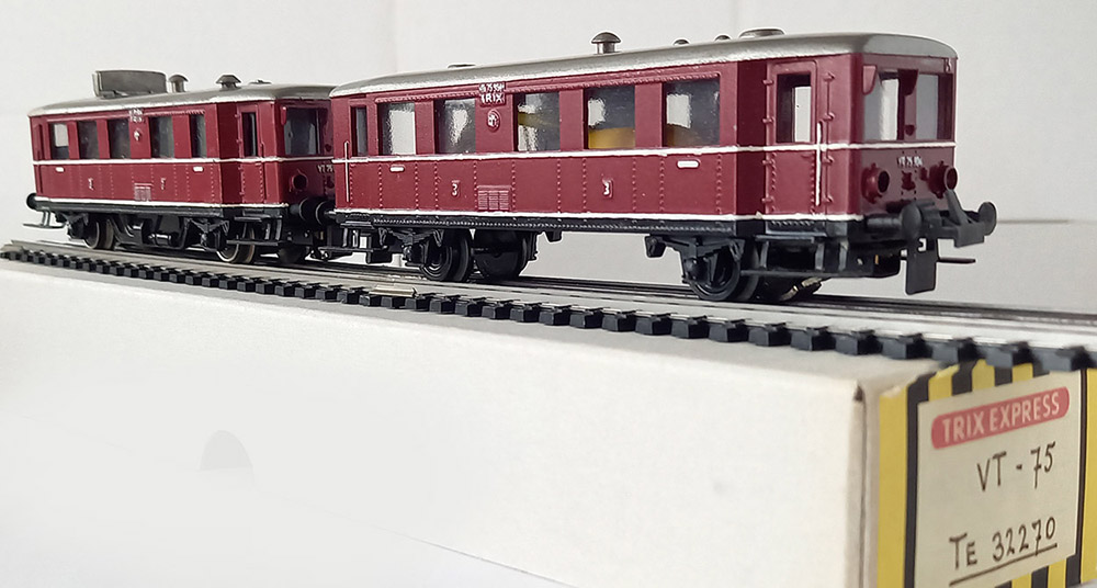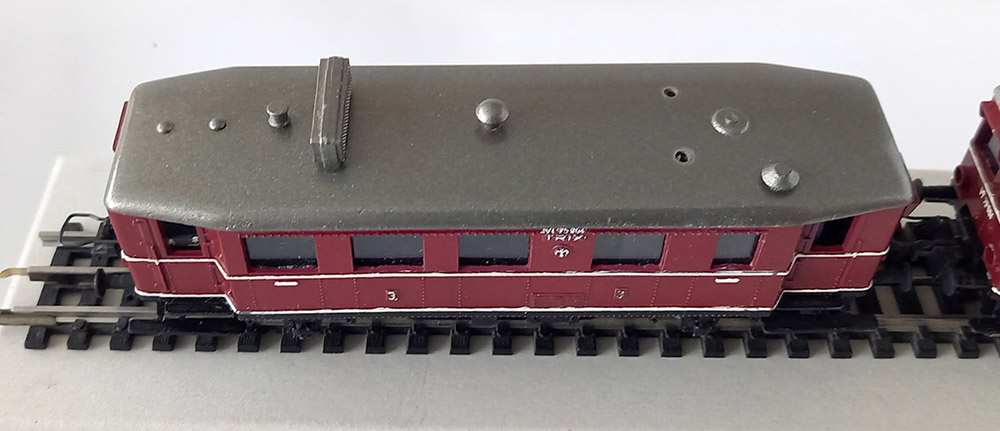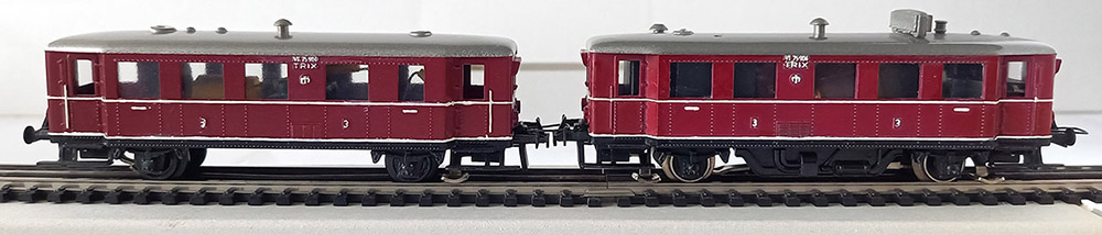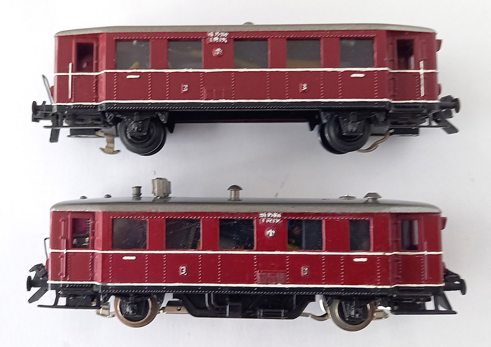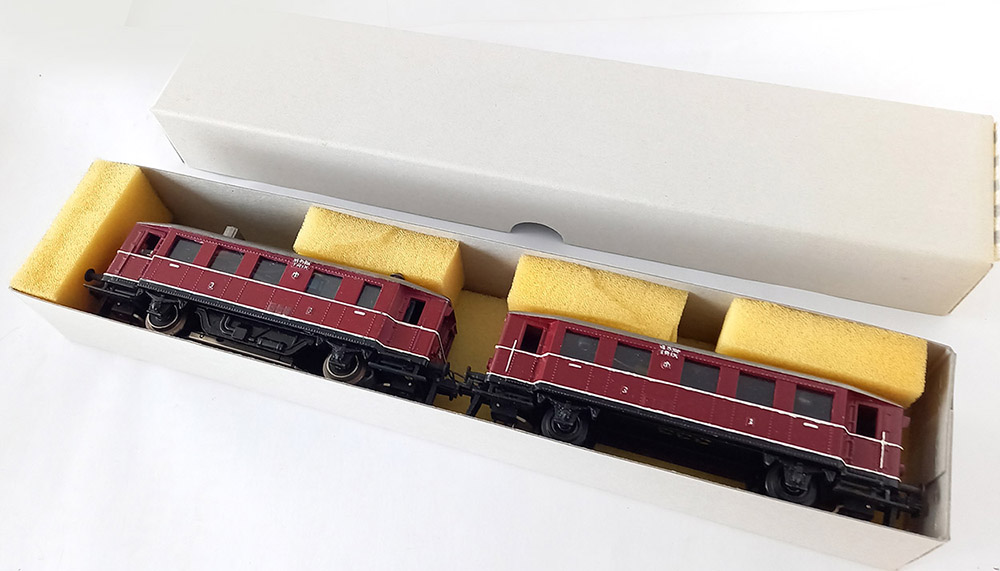 Model van een lokaalspoor-trein van de Duitse Spoorwegen. Frontverlichting (slechts) aan 1 zijde. Totale lengte ca 28 cm. Op het dak van de motorwagen missen wat ornamenten, maar het treinstel rijdt goed en wordt geleverd in vervangende verpakking. Produktie uit eind 60/70 er jaren.