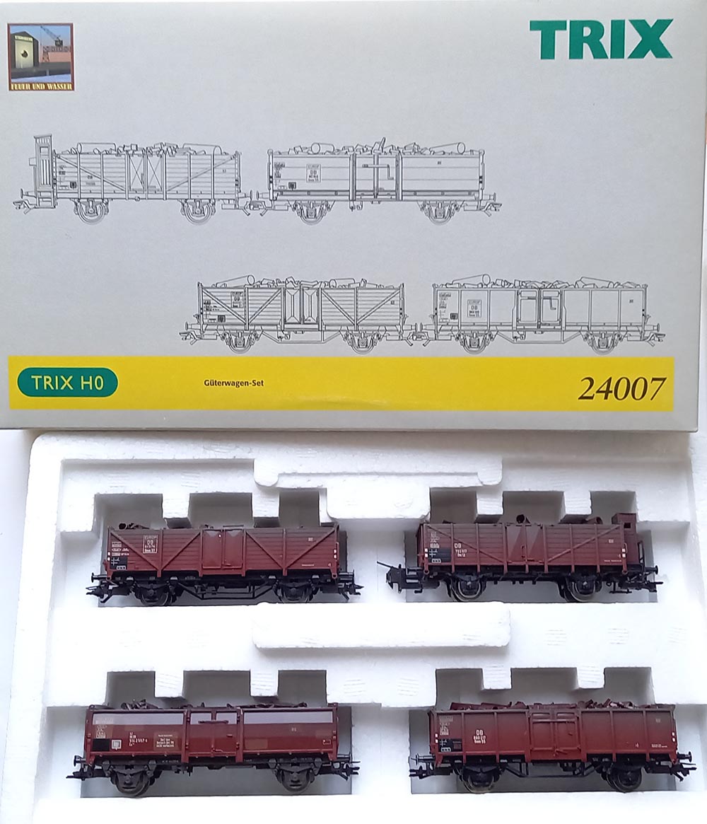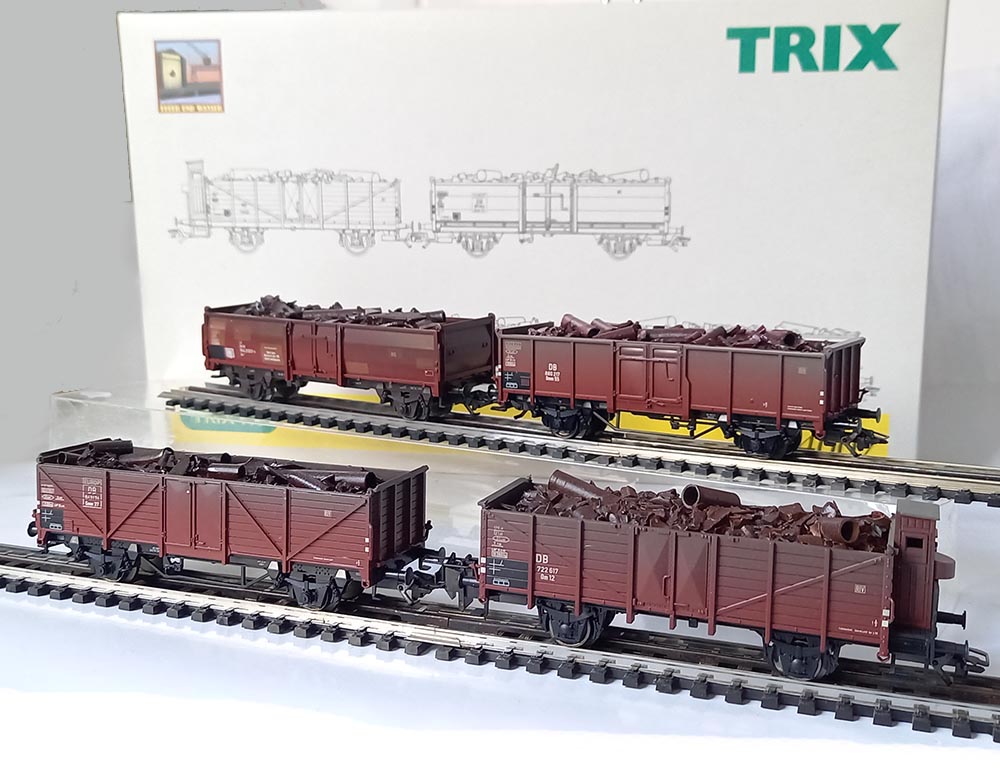 naar de volgende voorbeelden bij de Deutsche Bundesbahn: 1 Omm 52, 1 Om 12 met remmershuis, 1 Omm 37 met trekwerk, 1 Omm 55 met trekwerk. Alle 4 wagens gevuld met "schroot" en geweathered. Märklin koppelingen, brede wielen, epoche III. Wordt geleverd nieuwwaardig (of nieuw) in originele verpakking.
