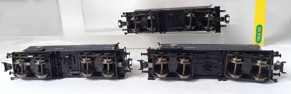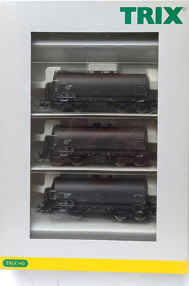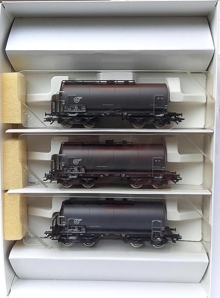 met 3 Vierassige ketel-wagens 'VTG' van de Duitse Spoorwegen. Märklin koppelingen, brede wielen, epoche III. Wordt geleverd nieuwwaardig (of nieuw) in originele verpakking.