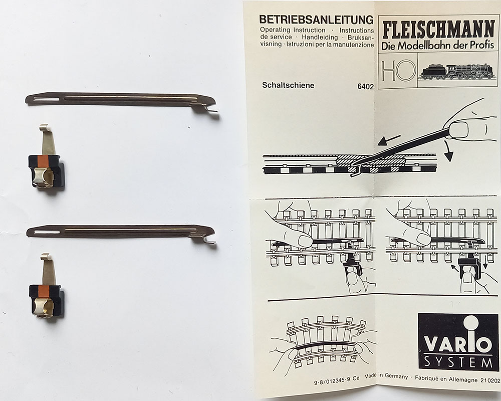 Voor model-rail. Schakelkontakt. Hiermee kan de Fleischmann locomotief een schakel-puls afgeven. Kan op elk (liefst) recht gedeelte geplaatst worden. Nieuw.