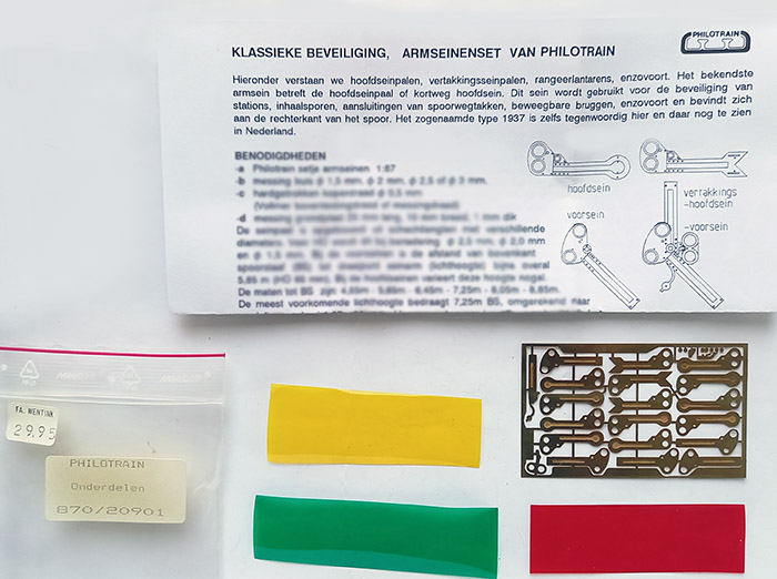 Diverse seinarmen gestanst in messing + bouwbeschrijving hoe een seinpaal te maken. Nieuw in originele verpakking.