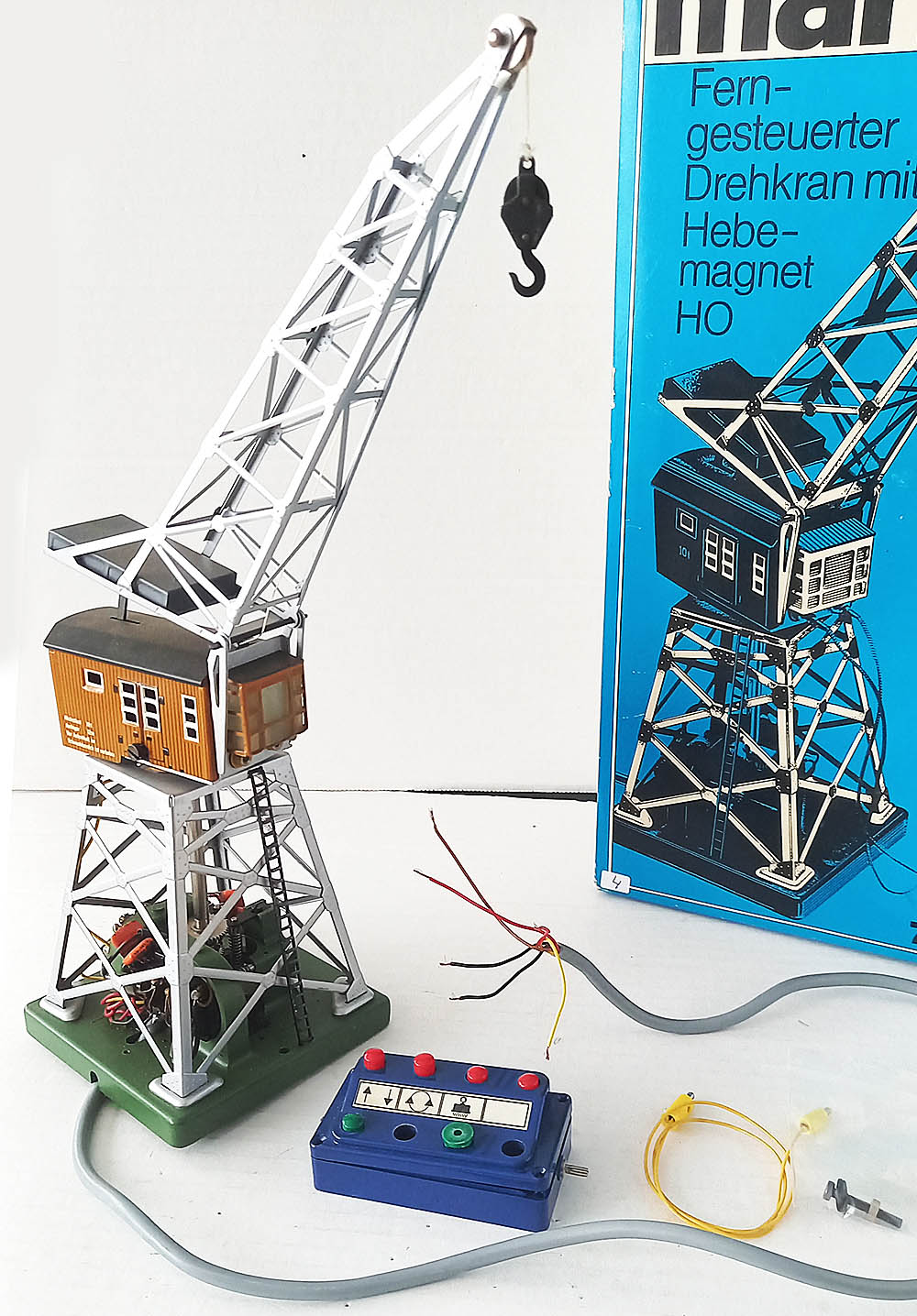 Type met geel/bruin kraanhuis, metaal, 2-motoren voor de functies draaien en heffen, zonder electromagneet, wel verlichting, bedieningskastje is open geweest, stekkertjes ontbreken, knoppen liggen er los in. De kraan is in nieuwstaat maar functioneert niet. Vermoedelijk is de olie in de motoren hard geworden waardoor er geen beweging is. De kraan wordt geleverd in de originele blauwe verpakking met gebruiksaanwijzing en is optisch in uitstekende staat.