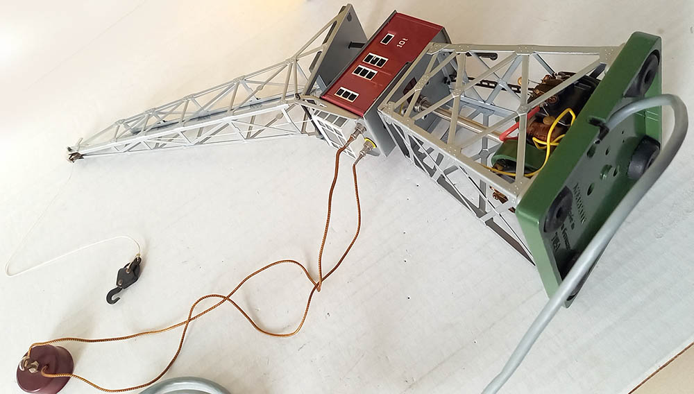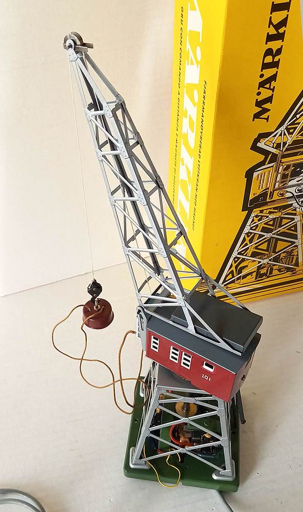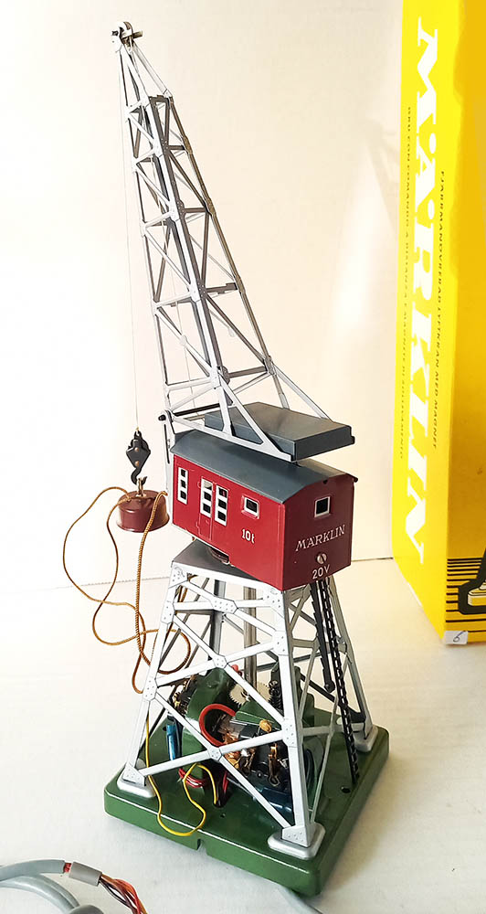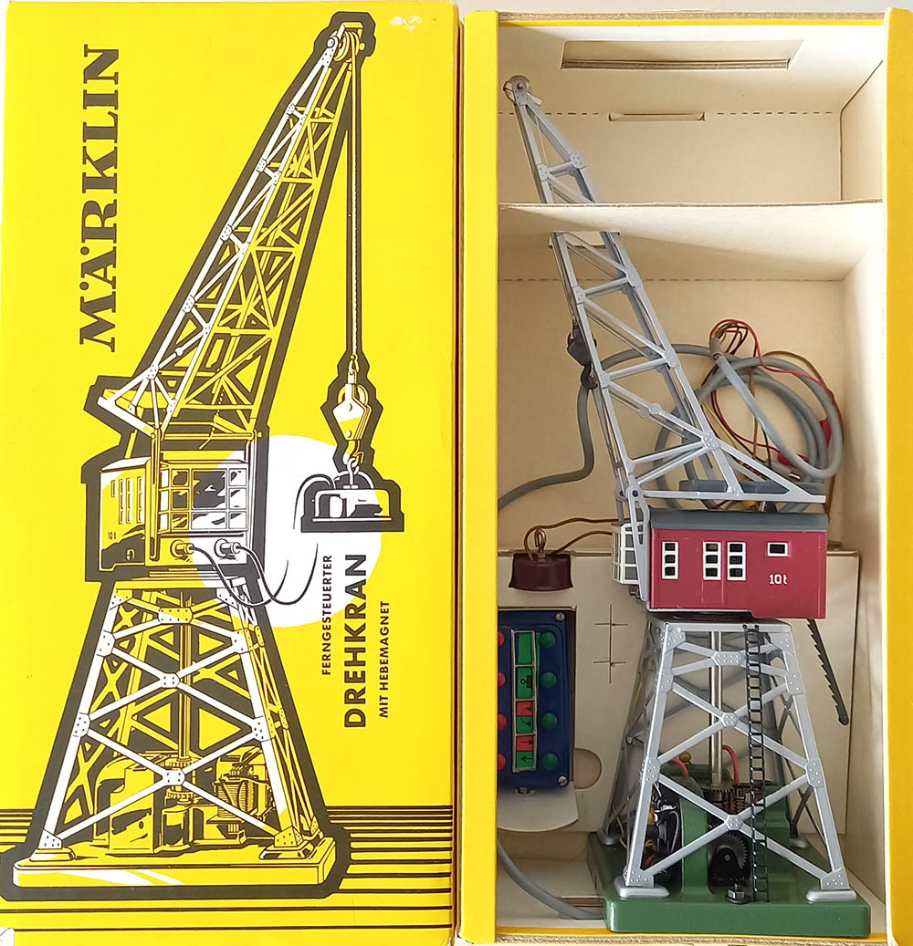 Oudere type met roodbruin kraanhuis, metaal, 2-motoren voor de functies heffen en draaien, met electromagneet, verlichting, bedieningskastje wat stroef. Alle functies getest. De kraan wordt geleverd in de originele gele verpakking + Gebruiksaanwijzing. Uitstekende staat. Produktie van 1956-1978.