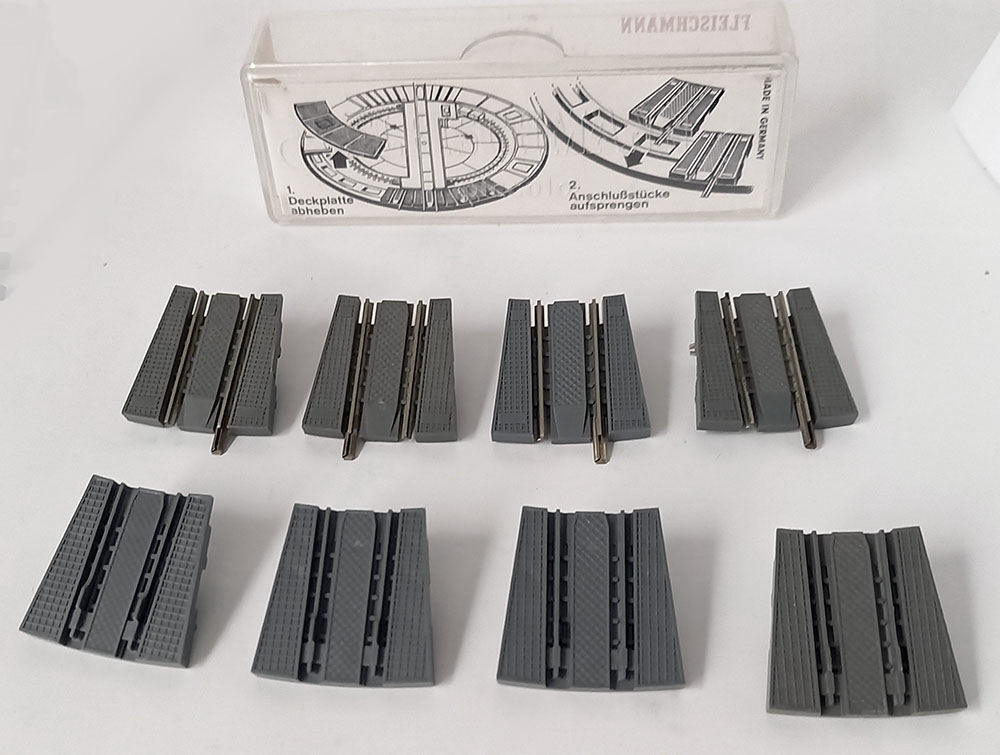 N-spoor. Draaischijf uitbreidingsset voor handdraaischijf 9150; bestaande uit 4 oprijrailstukken en 4 contrarails. Gebruikt in originele verpakking.