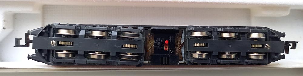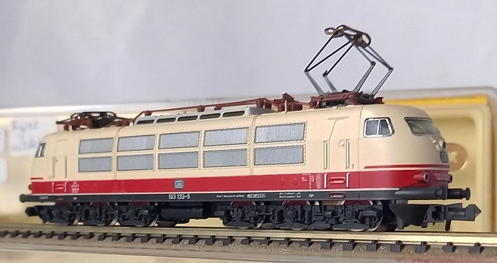 van de Duitse Spoorwegen, 6-assig, beige/rood, lengte 122 mm, frontverlichting wisselend met de rijrichting, schakelaar voor boven- of onderleiding. Epoche IV. Weinig gereden. Uitstekende staat in originele verpakking met gebruiksaanwijzing.