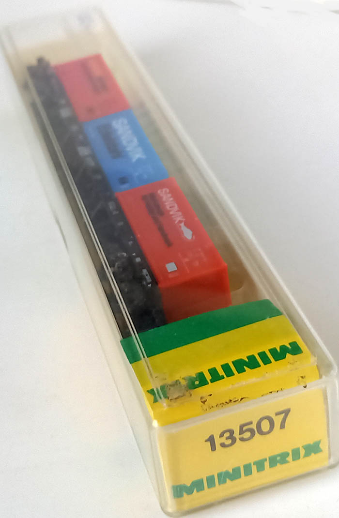type Sss-y 716 van de Duitse Spoorwegen, 4-assig, zwart met 3 Containers met opschrift ´SANDVIK´ Epoche IV. Uitstekende staat in originele verpakking.