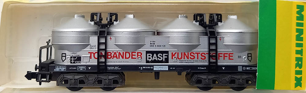 4-assig, zilverkleurig, met opschrift ´BASF TONBÄNDER KUNSTSTOFFE´. Wagen van de Duitse Spoorwegen. Epoche IV. Uitstekende staat in originele verpakking.