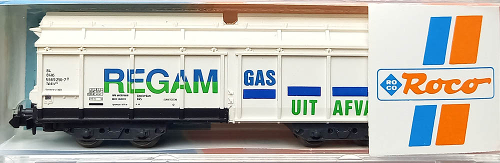Type Takkls van de Nederlandse Spoorwegen, 4-assig, wit, met opschrift ´REGAM GAS UIT AFVAL´. 2003. Epoche IV. Nieuwwaardig in originele verpakking.