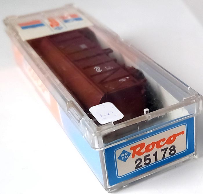 type Gbs 252 van de Nederlandse Spoorwegen, 2-assig, bruin, Epoche IV. Nieuwwaardig in originele verpakking maar 1 koppeling veert niet.