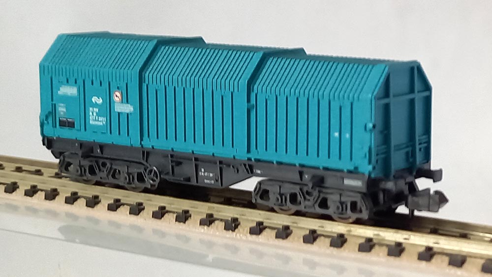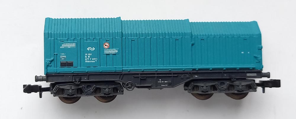 groenblauw, type Shimmns 358 van de Nederlandse Spoorwegen, telescoopdak, niet schuifbaar, Lengte 7,5 cm. Uitstekende staat.