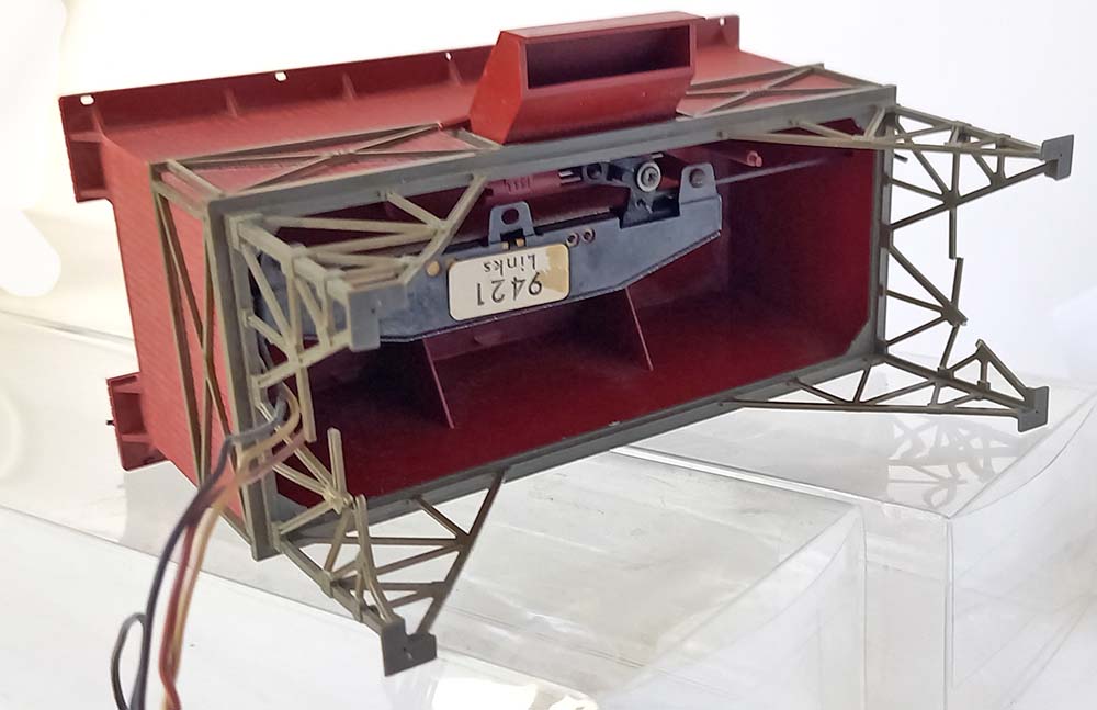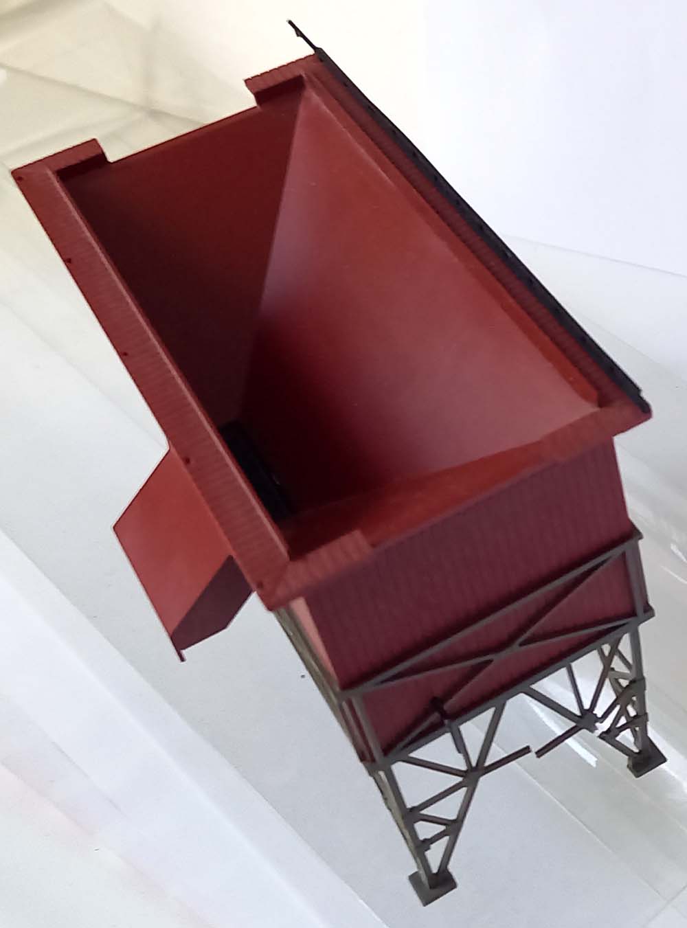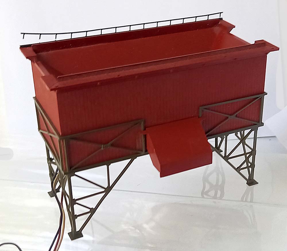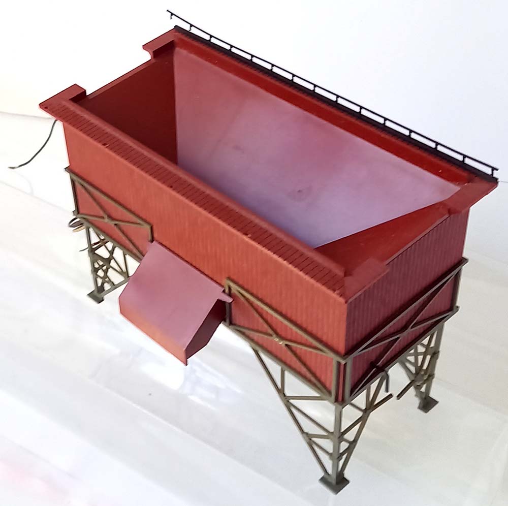 N-spoor. Stortgoedverlaadinstallatie. Voor het automatisch storten in de zelflosser 8520. De afsluitschuif in de uitlooptrechter kan voor het lossen van de silo met de hand bediend worden, maar de electrische aandrijving is ook meegeleverd en functioneert. De hoogte van het bordes is 80 mm, de hoogte van de onderkant van de uitlooptrechter is 30 mm boven de bodem. Wat hier mist is de speciale losrail en een gedeelte hekwerk. Redelijke staat.