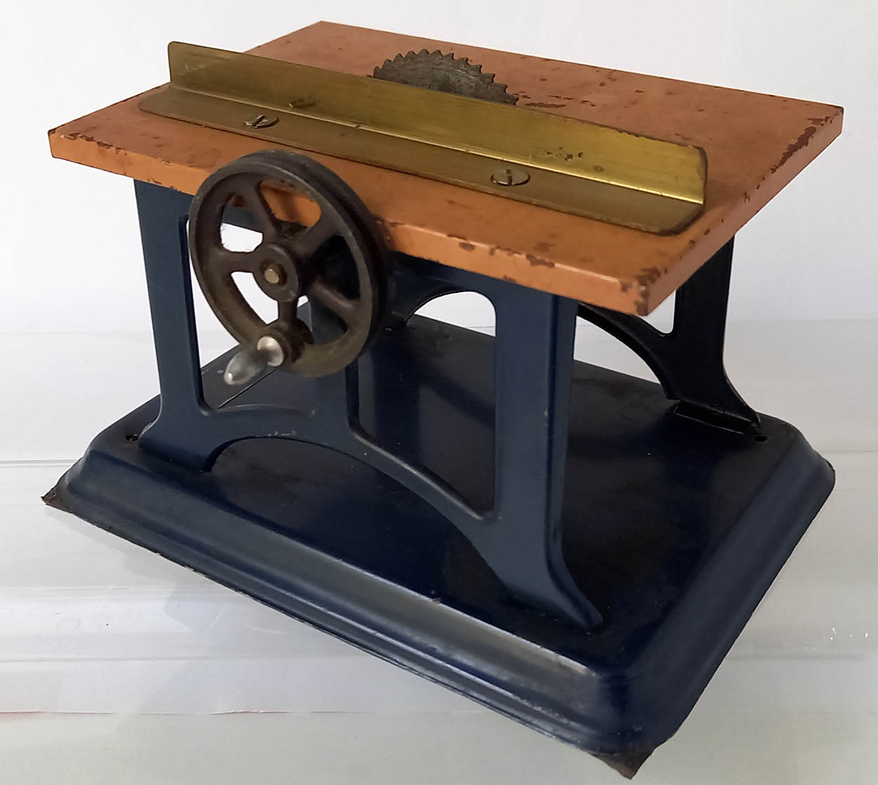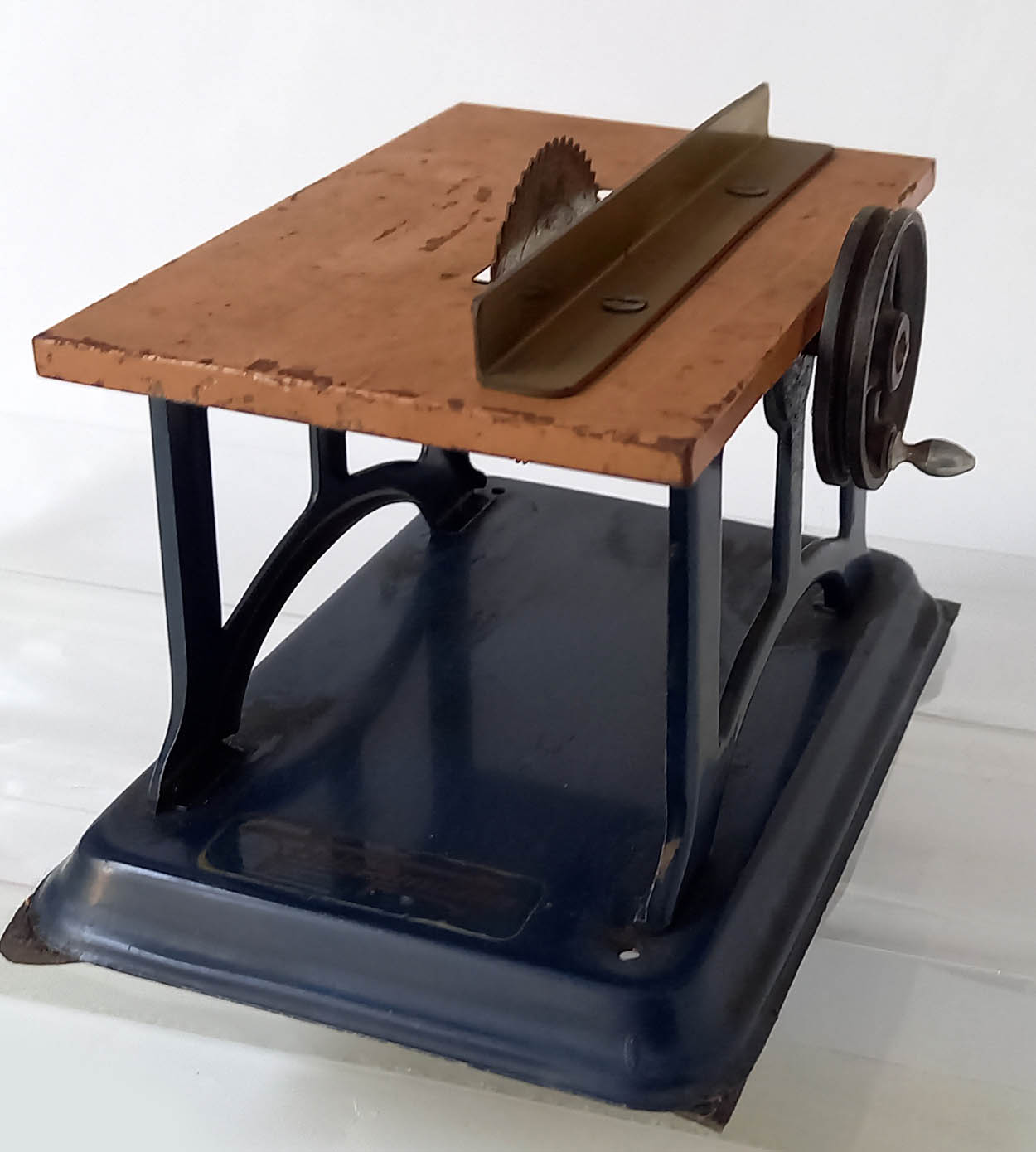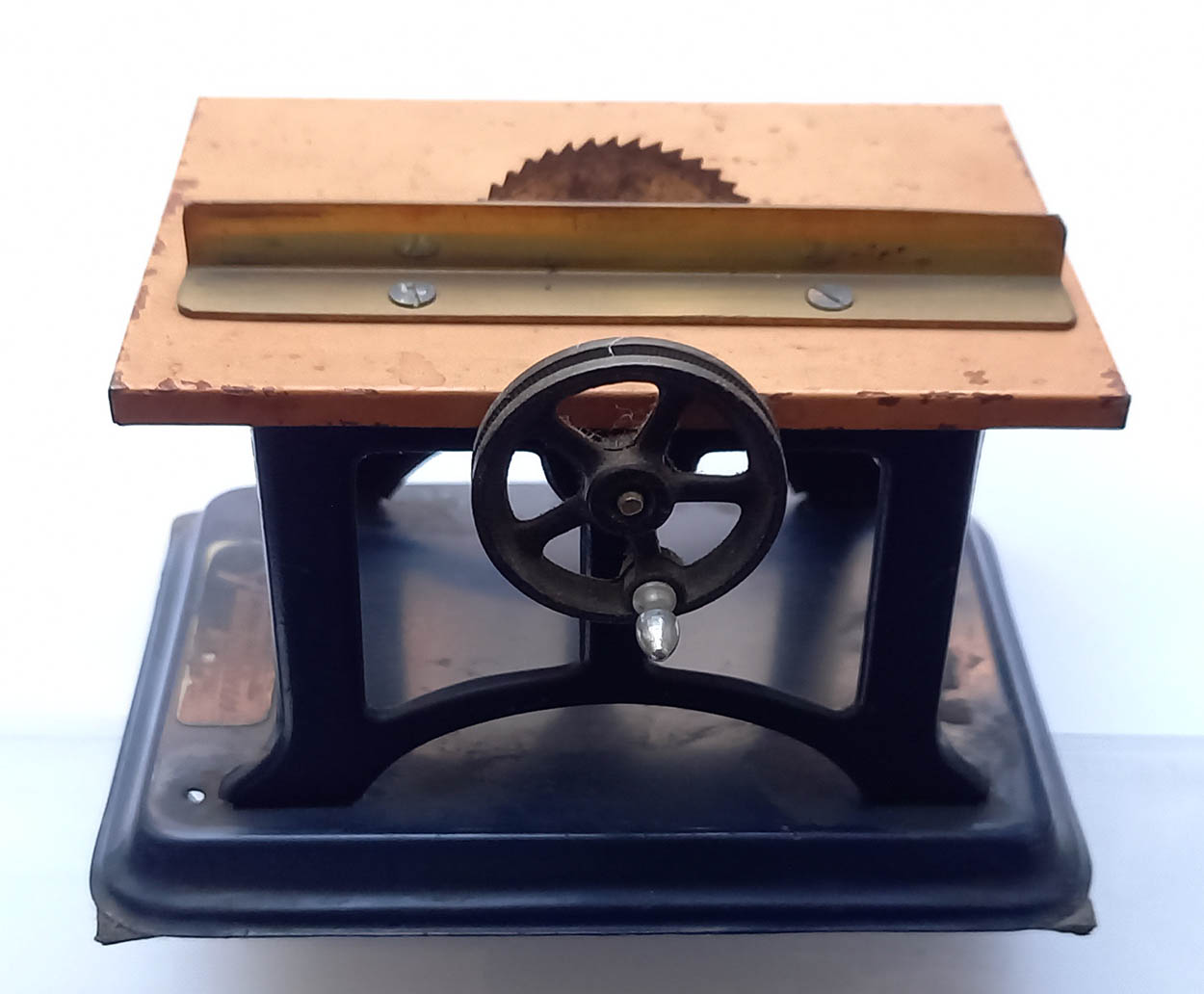 Fleischmann cirkelzaag met verstelbare aanslag. Lengte 13 cm, breedte 9 cm en hoogte 9 cm. Gebruikte staat.