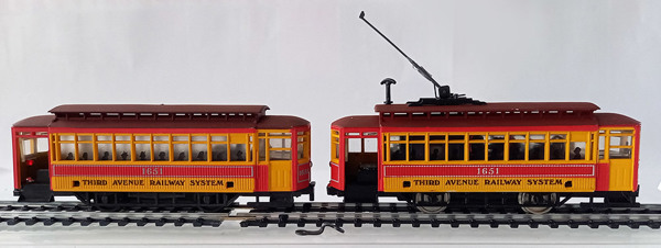 Rood/gele Mehano Tram met bijwagen. Opschrift Third Avenue Railway System. De tram is getest en heeft licht aan 1 zijde. Analoog. De koppeling tussen de beide stellen ligt los bij.