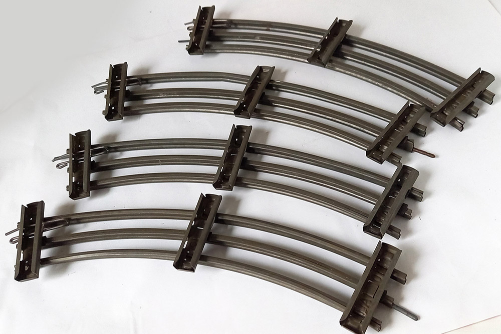 samen een halve cirkel vormend. Met geïsoleerde middenrail, geschikt voor electrisch rijden. Spoor-0. Redelijke staat.