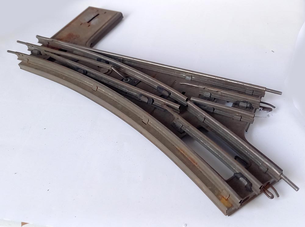 Met geïsoleerde middenrail, geschikt voor electrisch rijden. Spoor-0. Werkt niet, tong is wel met de hand te bewegen.
