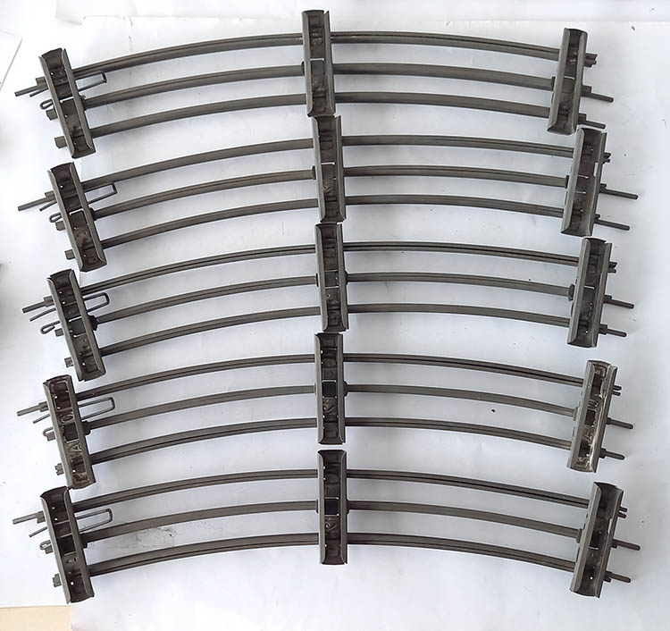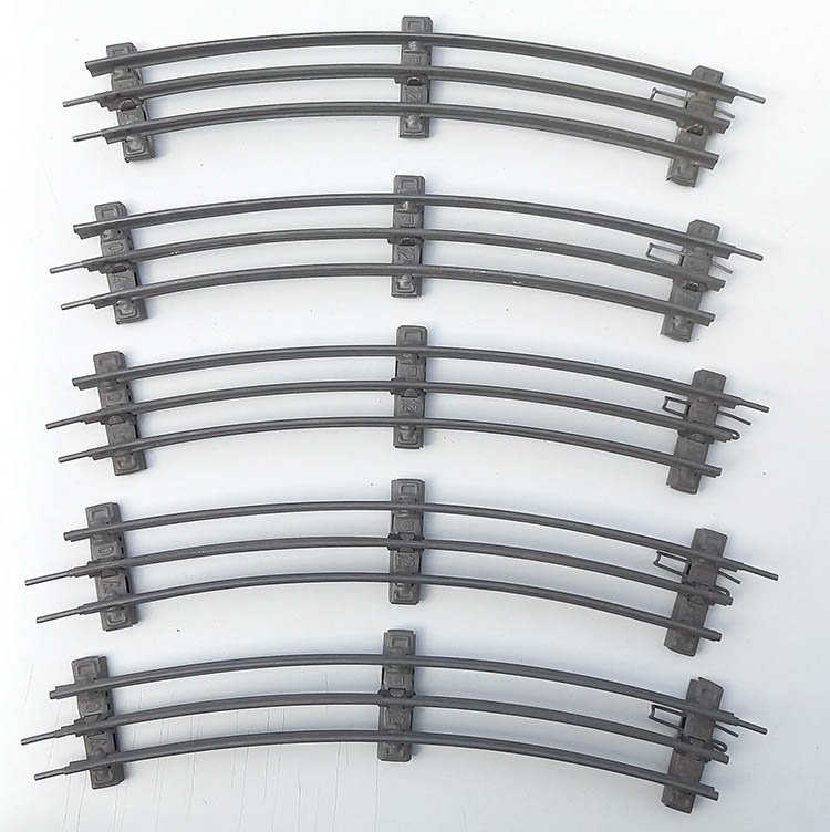 5 stuks. ca. 32 cm. Buitenbocht met geïsoleerde middenrail, geschikt voor electrisch rijden. Spoor-0. Goede staat.