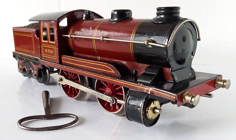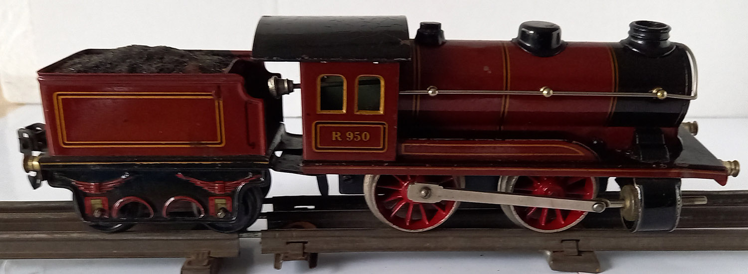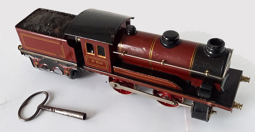 met twee assige tender nr 959, opwindbaar, roodbruin/zwart gelitographeerd metaal, lengte 29 cm, getest en werkend, rijdt voor- en achteruit, rem, drijfstangen, galeriestangen, met sleutel (maar dat is waarschijnlijk geen Märklin) Spoor-0, produktieperiode 1927-1933. Goede staat.