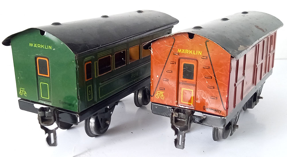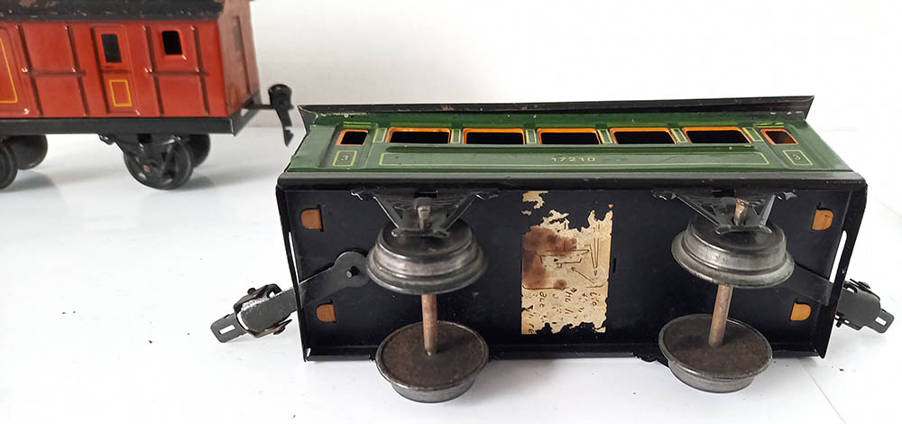 Personenwagen 1721 (1932-1937), 2-assig, lengte 14,5 cm, groen gelitographeerd metaal en daarbij bijpassende baggagewagen 1722 (1932-1937) roodbruin, gelitographeerd blik, 14,5 cm. Beide wagons zien er redelijk uit behalve de daken. Spoor-0.