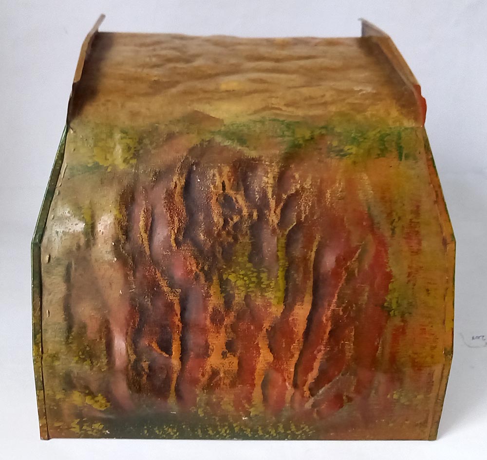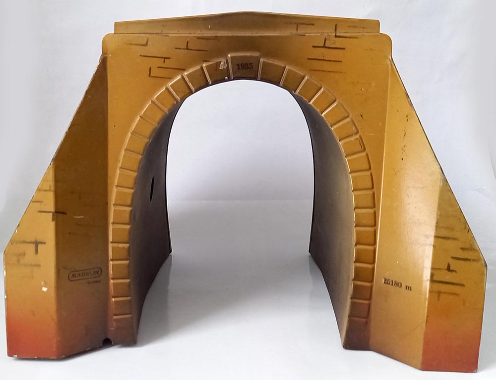30-er jaren. Geheel van blik. Opdruk 2518/0, te gebruiken bij spoor-0 en misschien ook wel bij spoor-1. De tunnel verkeert in uitstekende staat met slechts aan 1 zijde een kleine beschadiging. Doorrijhoogte ca. 15 cm, doorrijdbreedte beneden ca. 12 cm, Lengte 22 cm.