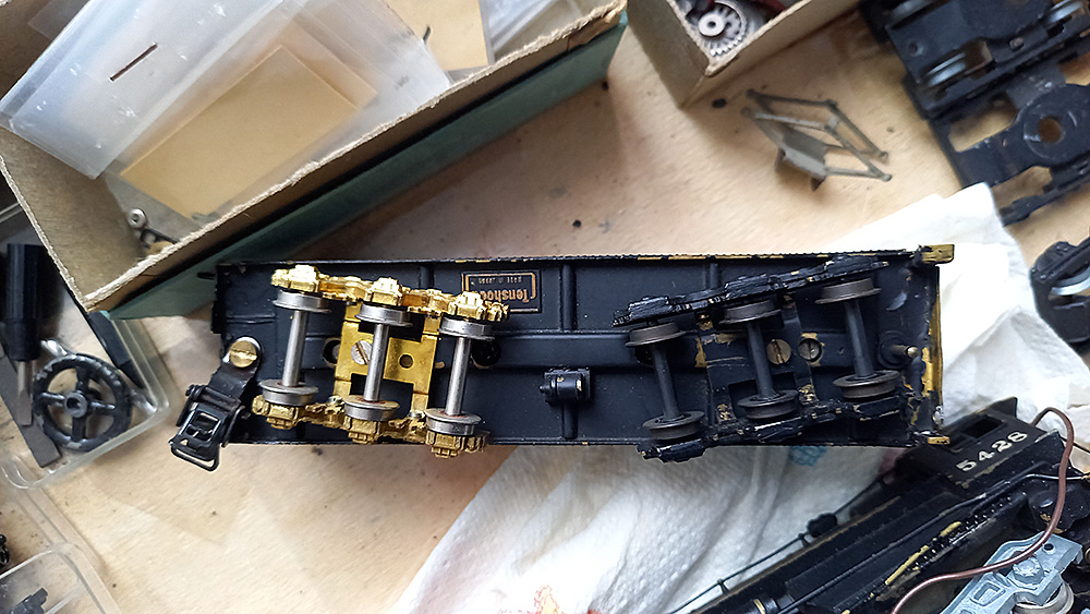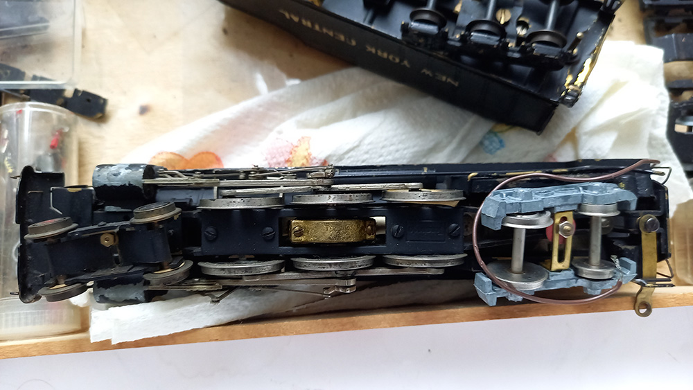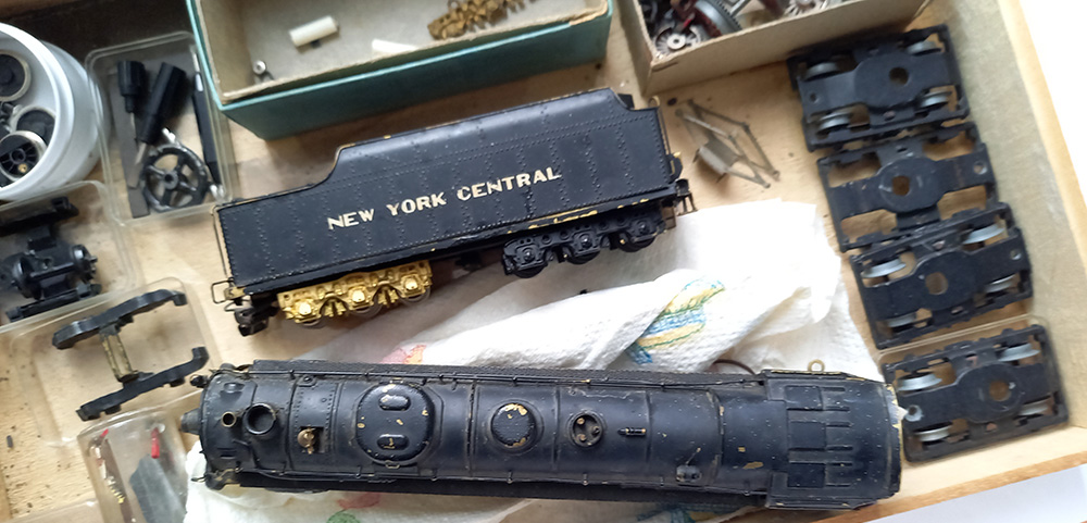 die helemaal vanuit Japan hiernaartoe gereisd is. Inclusief alle onderdelen in de kist. In de plastic zakjes (gele ondergrond) zitten miniscuul kleine onderdelen. De loc is compleet metaal (brass?), het licht brandt, maar verder niets.