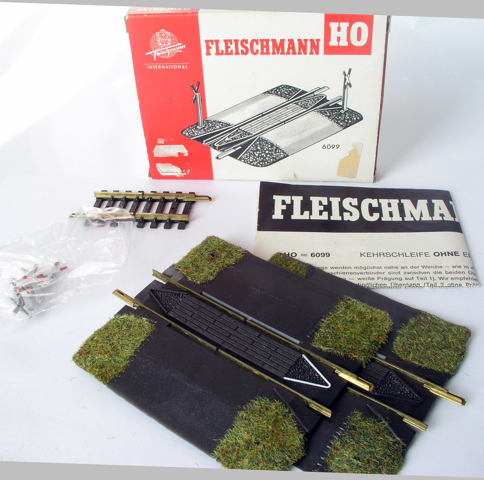 H0-spoor. Keerlusgarnituur in de vorm van een dubbele onbewaakte overweg met wielenrichter alsmede een onderbrekingsrail, 4 waarschuwingskruisen (niet afgebeeld) en de gebruiksaanwjijzing. Door in elkaar zetten van de railstukken kan de keerlus bereden worden zonder kortsluiting te veroorzaken. Niet geschikt voor FMZ. Uitstekende staat in originele verpakking.