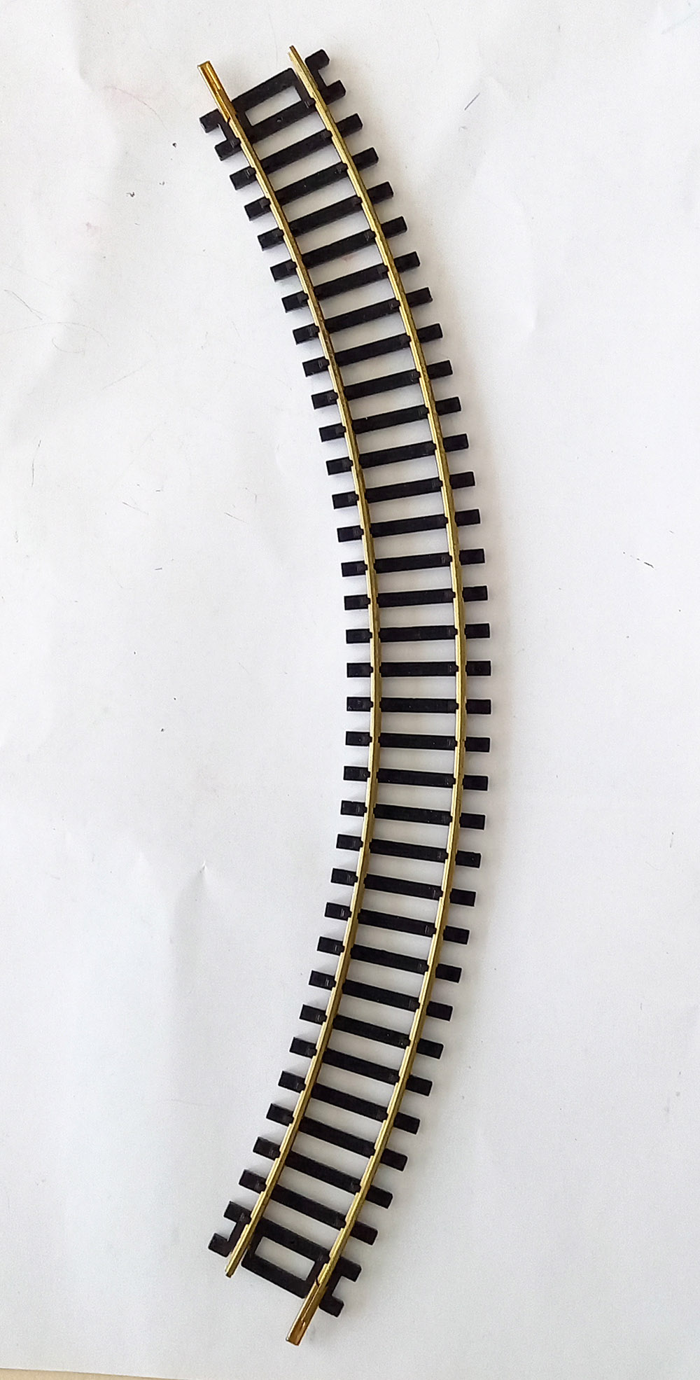 Gebogen rail, 60o. Alleen voor korte voertuigen geschikt. R1=250 mm. 3 Stuks vormen een halve cirkel. Buitendoorsnee 530 mm. Uitstekende staat.