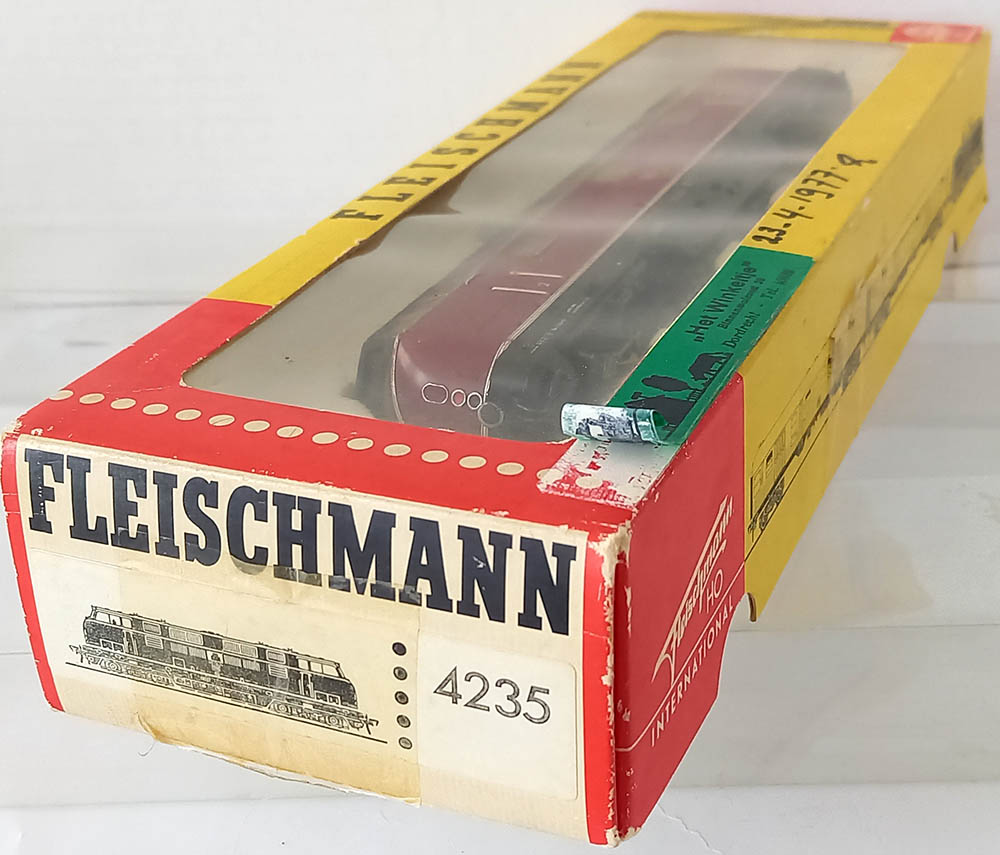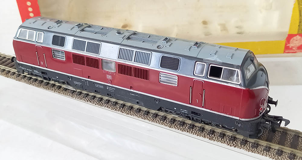 Dieselloc serie V200 van de Duitse Spoorwegen. Kunststof, rood/zwart, grijs dak, drielicht frontver-lichting wisselend met de rijrichting. Goede staat in (gehavende) verpakking.