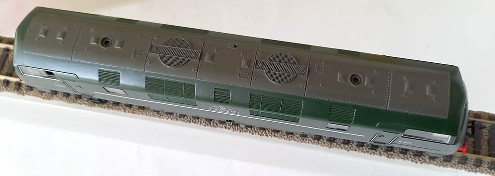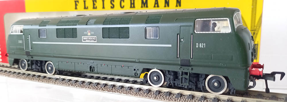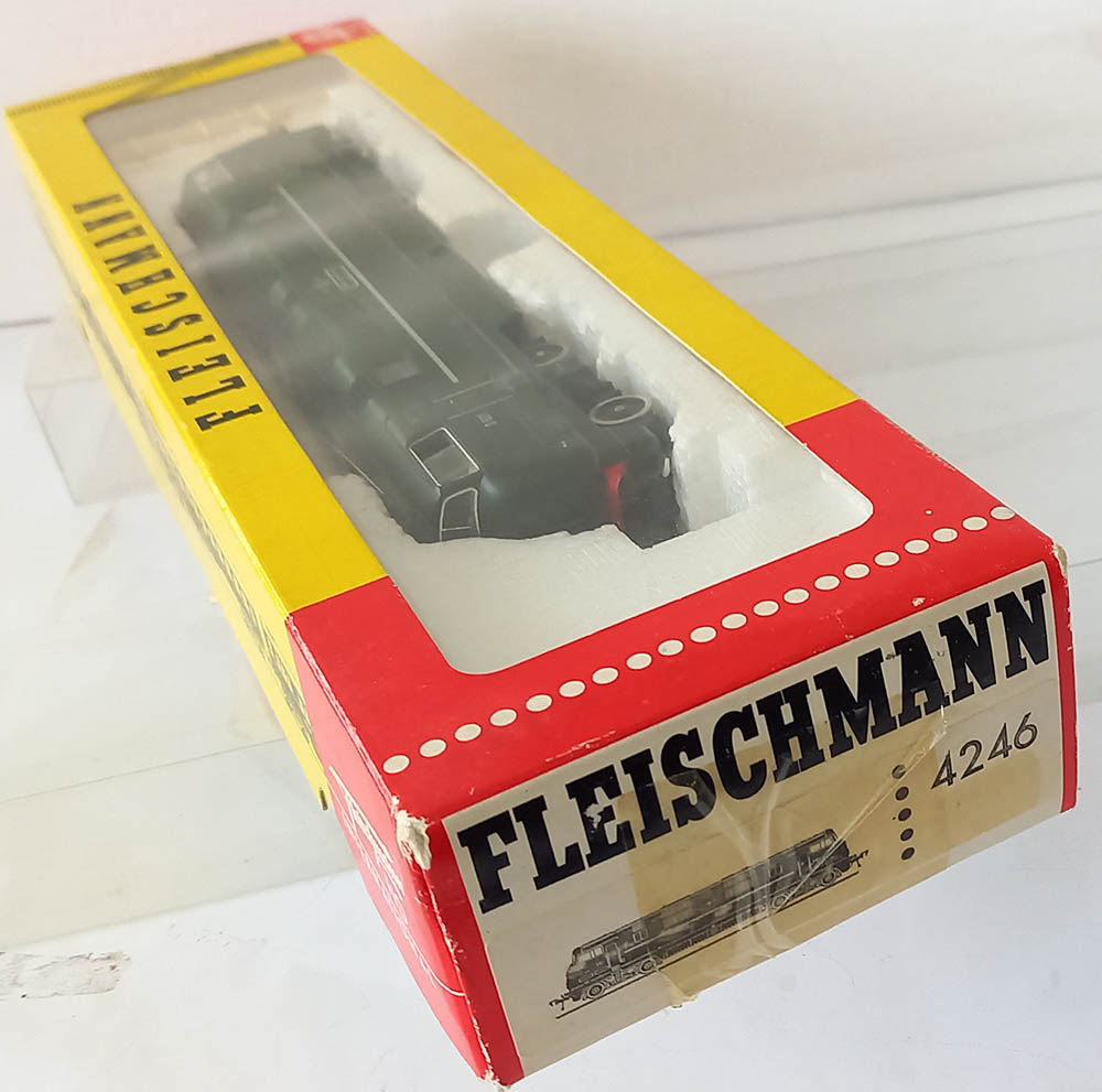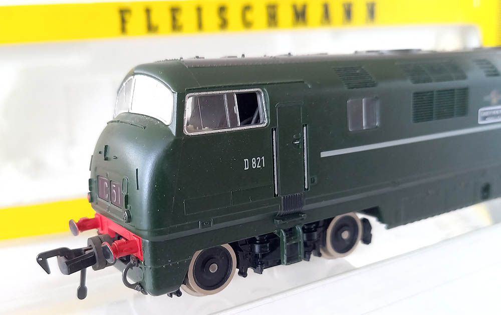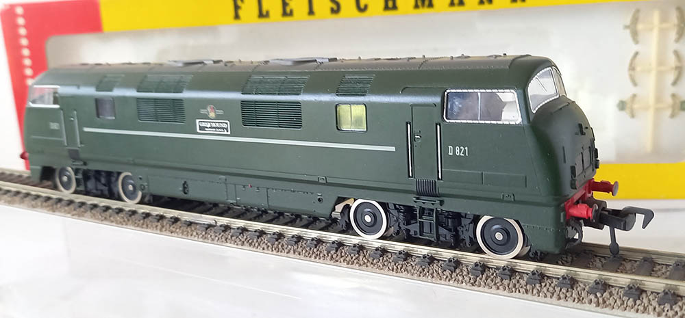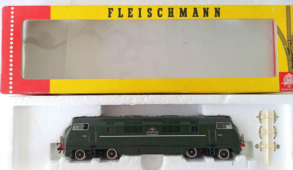 van de ‘Warship’-klasse van British Railways in de groene kleur. Wisselende verlichting bij veranderen van de rijrichting. Soepele en rustige loop. Uitstekende staat in originele verpakking inclusief de schilden om aan de loc te bevestigen. Nouveauté van 1977. Wordt geleverd in de originele verpakking zonder gebruiksaanwijzing.