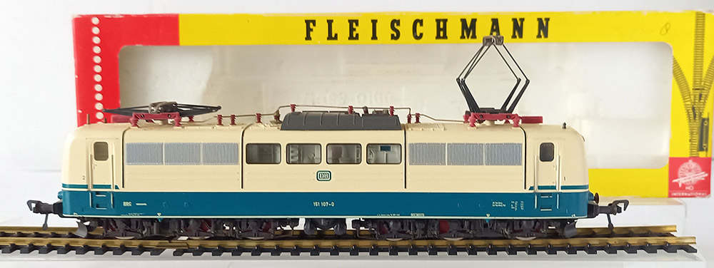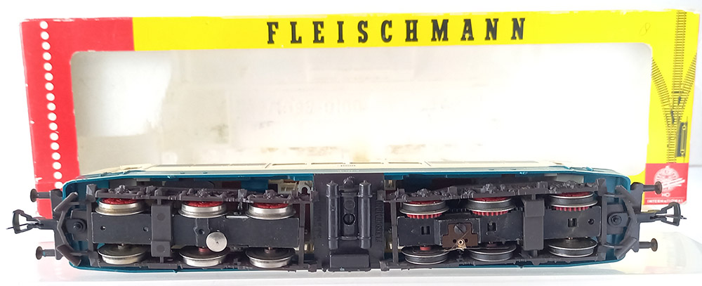 6-assig van de Duitse Spoorwegen. Lakering oceaanblauw/beige. Verende dakstroomaf-nemers, verlichting (slechts aan 1 zijde werkend), keuze voor stroomafname via boven- of benedenleiding. 4-antislipbanden. Haakkoppeling. Getest, gesmeerd en goed rijdend. Wordt geleverd in de originele verpakking. Geen handleiding.