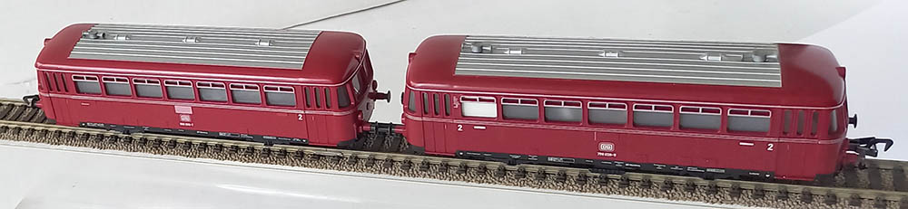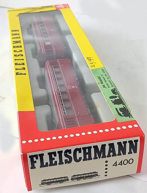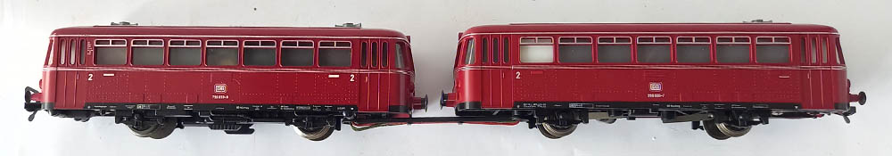 Combinatie van motor-en bijwagen. Kleur rood. Opbouw van kunststof onderstel metaal, lengte 305 mm. Vensters met cellonramen, 3-licht frontverlichting wisselend naar rood bij verandering van rijrichting. Beide eenheden zijn voorzien van binnenverlichting. Uitstekende goedrijdende eenheid in originele verpakking (waarop is geschreven).