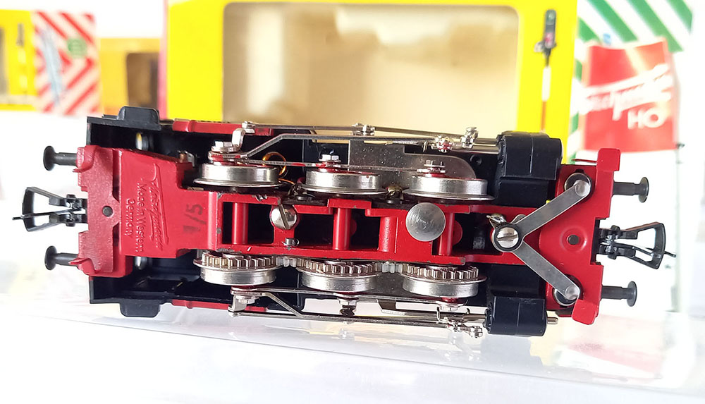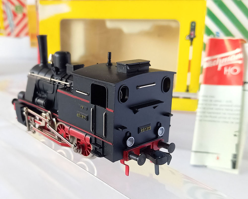 - 1315 Tenderlocomotief , BR89 van de Duitse Spoorwegen, type T3 van de voormalige koninklijke Bayerische staatsbaan, 3-assig, Lengte 115 mm. Metalen onderstel en kunststof bovenbouw. 2 werkende koplampen, uitgebreid drijfwerk. Model is gesmeerd en verkeert in uitstekende staat (nauwelijks gereden) desondanks rijdt deze bij lage snelheid niet helemaal soepel. In originele verpakking met gebruiksaanwijzing. Produktieperiode 1956-1969.