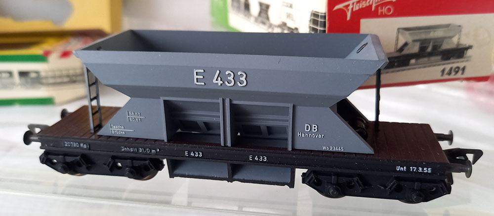 - 2 x 1491 grindwagen, grijs, versie met Duitse draaistellen. Onderstel metaal. Als nieuw in originele verpakking. Geproduceerd van 1961-61/69.