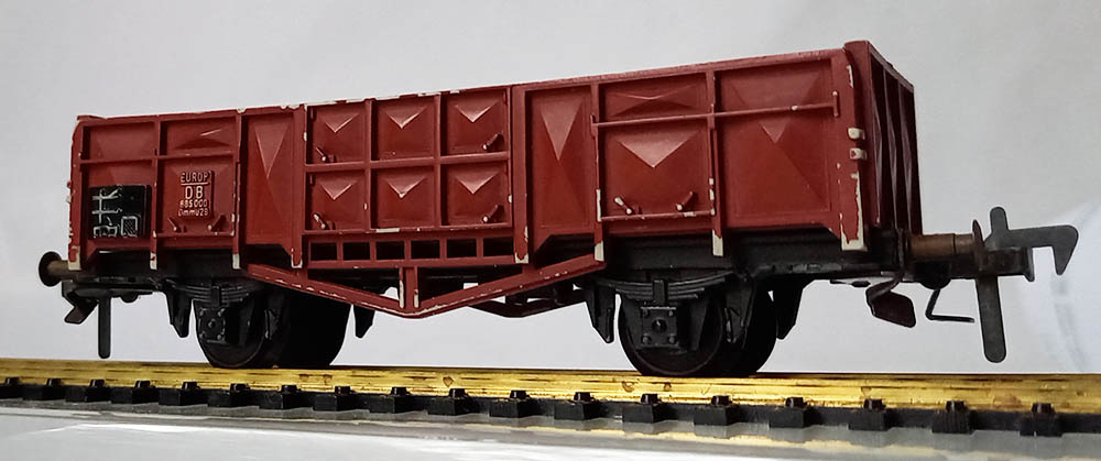 van de Duitse Spoorwegen, type Omm 39". Metalen onderstel. Grijze vloer. Lengte 120 mm. 60-er jaren. Bespeeld.