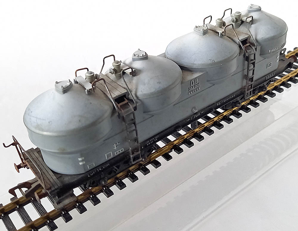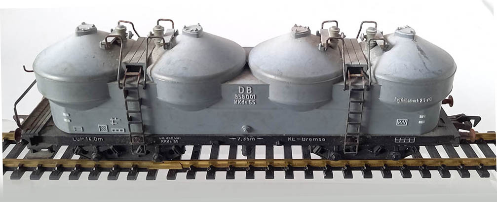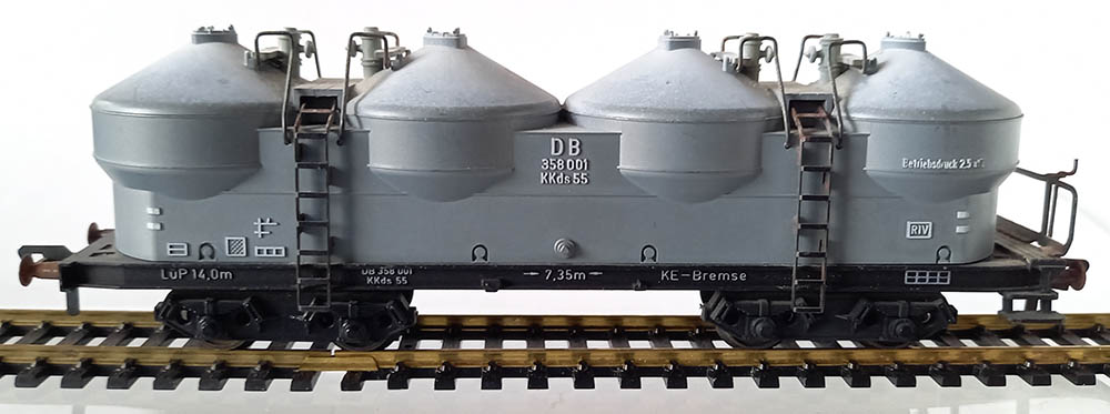 4-assig, model van de silowagen KKds 55 van de DB voor perslucht lossing. Wagenopbouw licht-grijs.Origineel met beschrif-ting en originele wheatering bij de domen.Lengte 170 mm. De wagen verkeert in goede staat.