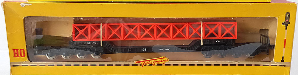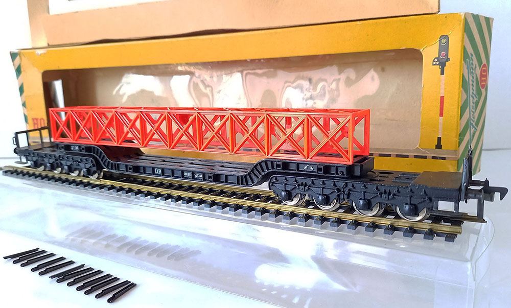 type SSt 34 van de Duitse Spoorwegen, 6-assig, metaal, met 12 insteekbare rongen, beladen met een brugdeel. Lengte 290 mm. Uitstekende staat in originele complete verpakking. Vintage, midden 60-er jaren.