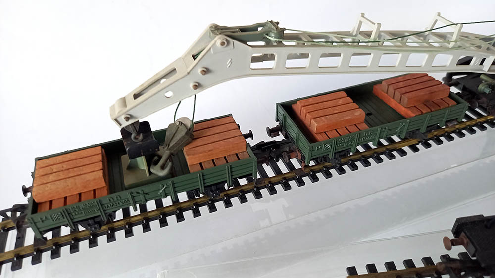 De kraanarm rust op ondersteuningswagen 1451A en afstandswagen 1451H zorgt ervoor dat de ondersteuningswagen op goede afstand blijft. Zowel de 1451A en 1451H bevatten elk twee houten onderstoppers waarmee de kraan tijdens de werkzaamheden stabiel blijft. Tesamen bevat de set inclusief de kraan 4 wagens. Apart toegevoegd zouden de gereedschapswagen 1464 G en werknemerswagon 1417 M kunnen worden. Lengte 485 mm. Goede staat.