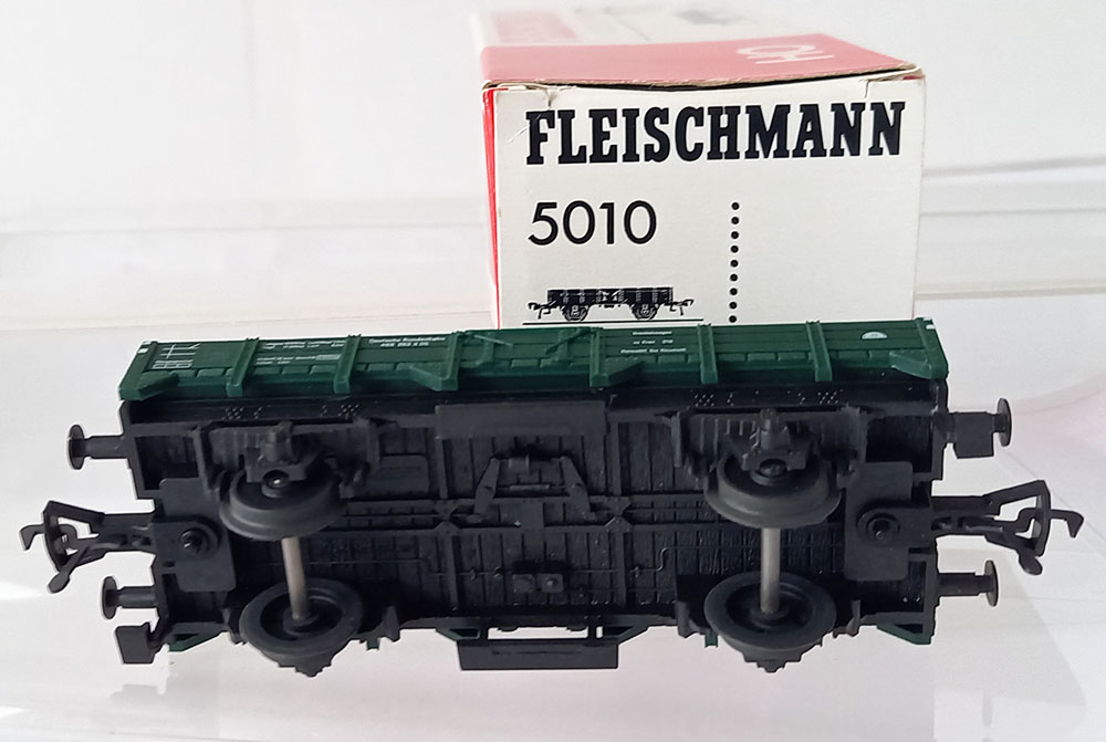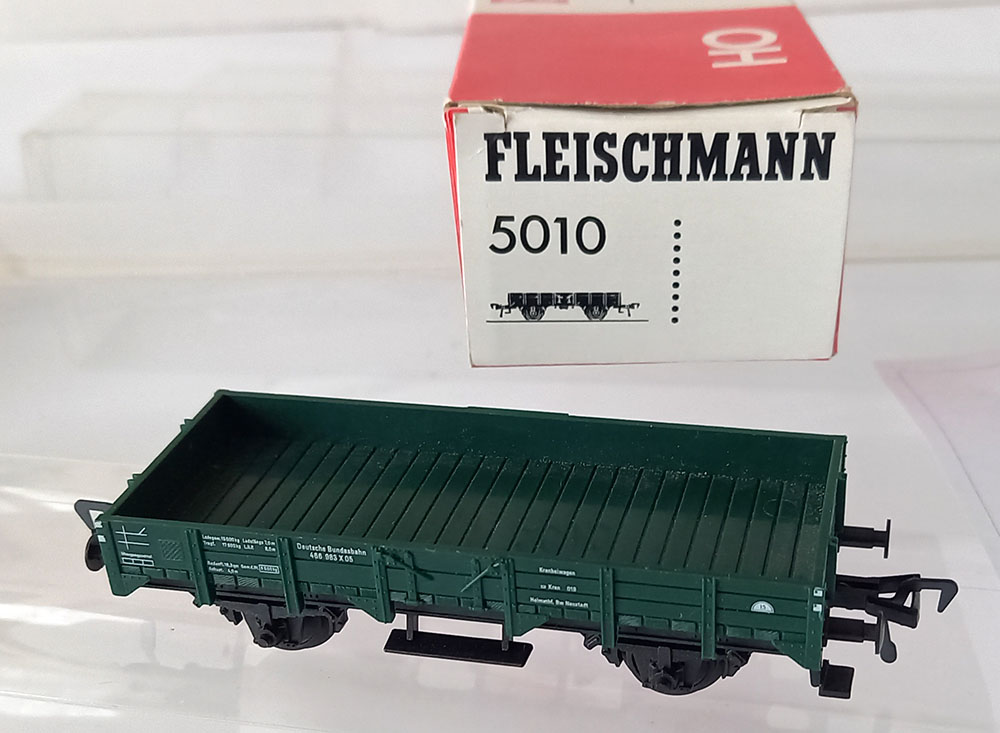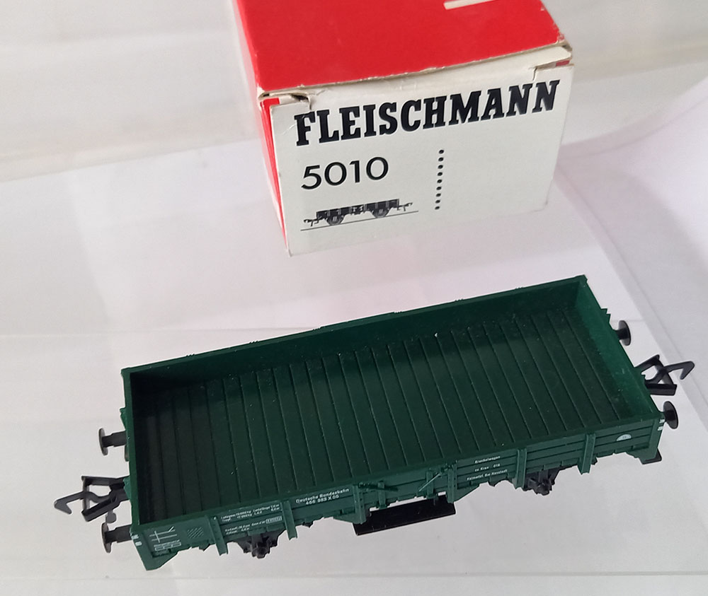2-Assige open goederenwagen van de DB. Steunwagen voor de kleine kraan nr 5019. Boven en onderbouw kunststof. Met beschrifting. Uitstekende staat in originele verpakking.